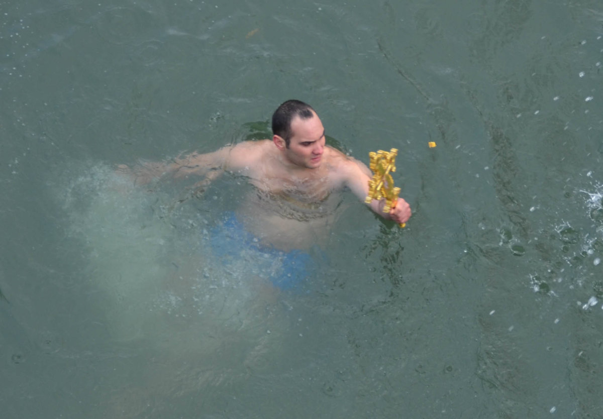 Συγκίνηση σε εκατοντάδες Λαρισαίους σκόρπισε ο Κωνσταντίνος Θανασιάς, ο οποίος και βούτηξε στα παγωμένα νερά του Πηνειού – μαζί με άλλους δύο συμπολίτες – για να πιάσει τον Τίμιο Σταυρό.