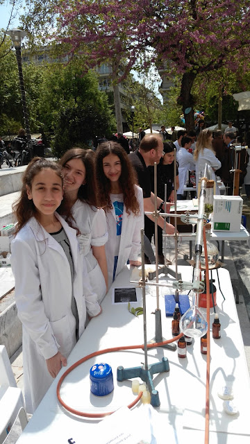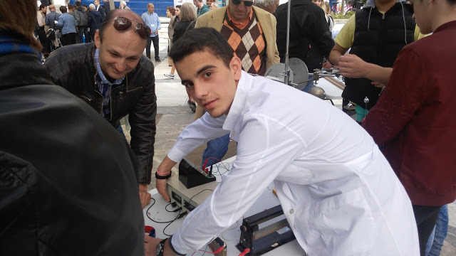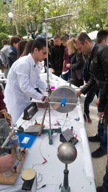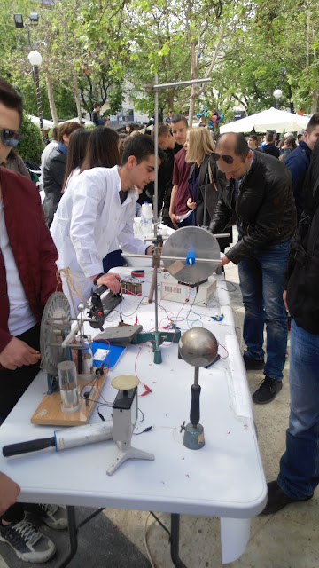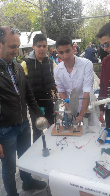Σε αυτόν τον χώρο της πλατείας λοιπόν, συγκεντρώθηκαν οι μαθητές των σχολείων Λάρισας και ένωσαν τις δυνάμεις και ικανότητές τους, δημιουργώντας πατέντες και καινοτομίες και αξιοποιώντας έως και μία αλυσίδα κι ένα γρανάζι ποδηλάτου για να μετασχηματίζουν την ενέργεια, χρησιμοποιώντας ρεύμα και νερό για να παράγουν ρεύμα και ενέργεια, μαγνήτες και πηνία για να ανυψώνουν αντικείμενα.