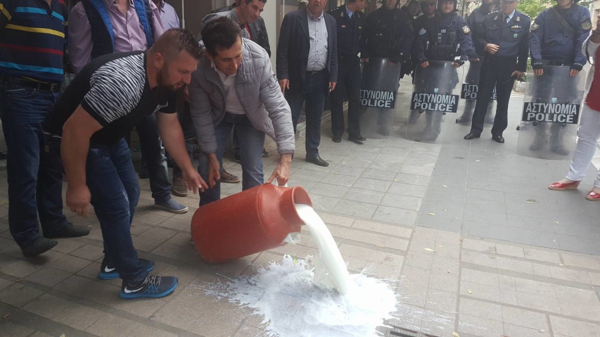 Μετά την συνάντηση και την ενημέρωση οι κτηνοτρόφοι έχυσαν γάλα στο σημείο επί της οδού Παπαναστασίου που τους είχαν σταματήσει τα ΜΑΤ.