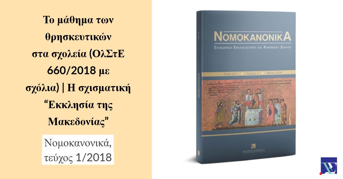 Με μελέτες επί επικαίρων θεμάτων, όπως η εκκλησιαστική πτυχή του «Μακεδονικού» ζητήματος, το μάθημα των Θρησκευτικών υπό το φως της πρόσφατης ακυρωτικής αποφάσεως του Συμβουλίου της Επικρατείας για τα νέα προγράμματα σπουδών, με άρθρα επί ζητημάτων που αφορούν στις σχέσεις Κράτους και Εκκλησίας, καθώς και με την πλέον πρόσφατη νομολογία επί σειράς σημαντικών δικαστικών αποφάσεων που άπτονται ζητημάτων εκκλησιαστικής φύσεως, κυκλοφόρησε προσφάτως το νέο τεύχος (1/2018) των «Νομοκανονικών».
