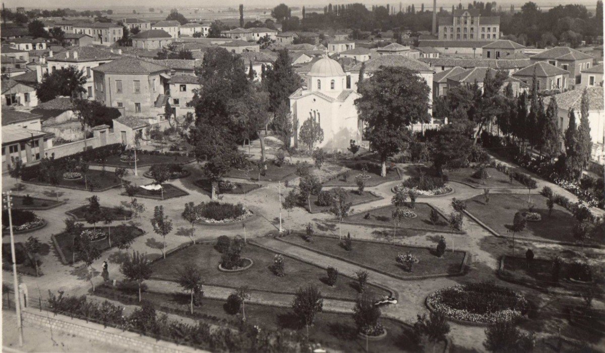 Η εικόνα που δημοσιεύεται αποτυπώνει την περιοχή του κήπου των Ανακτόρων όπως ήταν στις αρχές της δεκαετίας του 1930. Είναι έκδοση ενός δικού μας βιβλιοχαρτοπώλη, του Αντωνίου Παναγιωτακόπουλου, ο οποίος μεταξύ των άλλων ήταν και εκδότης επιστολικών δελταρίων (καρτ ποστάλ). Η συγκεκριμένη κάρτα έχει τον αριθμό 1076-1. Στο κέντρο διακρίνεται ένα μικρών διαστάσεων εκκλησάκι με τρούλο. Πρόκειται για το γνωστό παρεκκλήσι των βασιλικών ανακτόρων. Ήταν αφιερωμένο στον άγιο Βησσαρίωνα, μητροπολίτη Λαρίσσης. Σύμφωνα με ωραία προφορική παράδοση, την οποία καταγράφει ο δημοσιογράφος και εκδότης της εφημερίδας «Μικρά» Θρασύβουλος Μακρής[2], στο χώρο αυτό υπήρχε πολύ πριν από την απελευθέρωση της πόλεως από τους Τούρκους το 1881 μεγάλη οικία, αληθινό ανάκτορο, του οποίου οικοδέσποινα ήταν η Νουριέ χανούμ, στενή συγγενής του Αλή πασά και κρυπτοχριστιανή. Επέτρεπε σιωπηρά στο υπηρετικό προσωπικό του αρχοντικού, το οποίο προερχόταν από τη χριστιανική κοινότητα της Λάρισας, να χρησιμοποιήσουν ένα από τα δωμάτια όπου στεγάζονταν τα «οτζάκια», δηλαδή οι βοηθητικοί χώροι του σπιτιού (μαγειρεία, πλυσταριά, καταλύματα του προσωπικού, κλπ.) και να το μετατρέψουν σε χώρο λατρείας. Ήταν η περίοδος κατά την οποία είχε επικρατήσει κάποια σχετική θρησκευτική ελευθερία εκ μέρους των Οθωμανών. Στο μέσον του δωματίου είχαν τοποθετήσει μια παλιά εικόνα του αγίου Βησσαρίωνος, μπροστά από την οποία έκαιγε μέρα-νύχτα κανδήλα. Οι χριστιανοί του αρχοντικού και αρκετοί γείτονες, προσέρχονταν τις Κυριακές και τις εορτές για να ανάψουν λαμπάδα και να προσκυνήσουν την εικόνα του αγίου. Κάποια νύχτα όμως του Νοεμβρίου του 1872 μια πυρκαγιά αποτέφρωσε όλους τους βοηθητικούς χώρους του αρχοντικού. Η οικοδέσποινα απέδωσε το καταστρεπτικό γεγονός σε ολιγωρία του προσωπικού. Εκείνο το βράδυ είχαν ξεχάσει να ανάψουν την κανδήλα του αγίου, ο οποίος θέλησε να τους το υπενθυμίσει μ’ αυτόν τον τραγικό τρόπο. Όμως οι ζημιές αποκαταστάθηκαν γρήγορα και η λειτουργία του παρεκκλησίου συνεχίσθηκε.