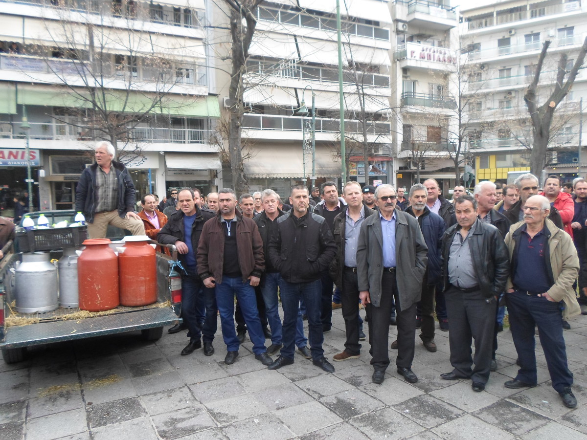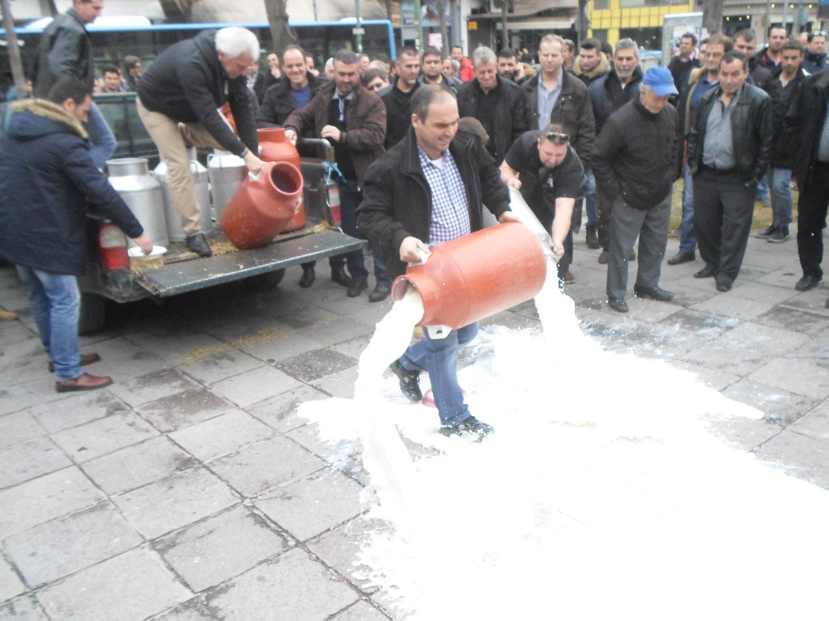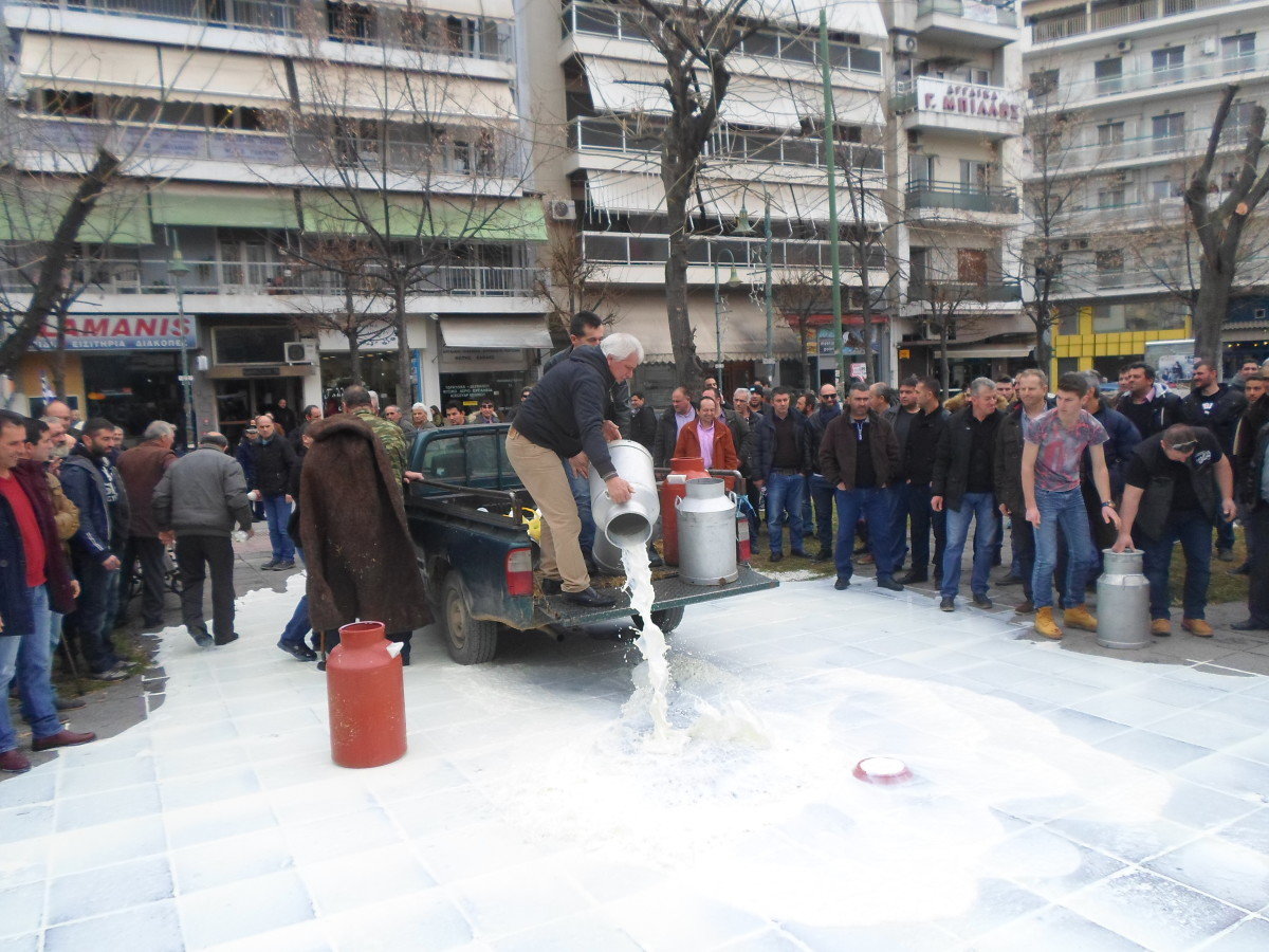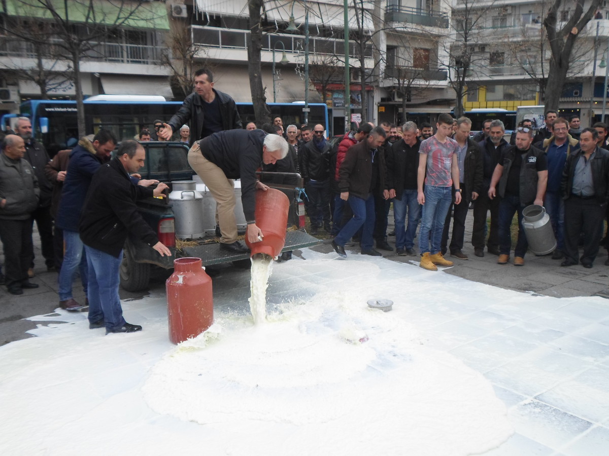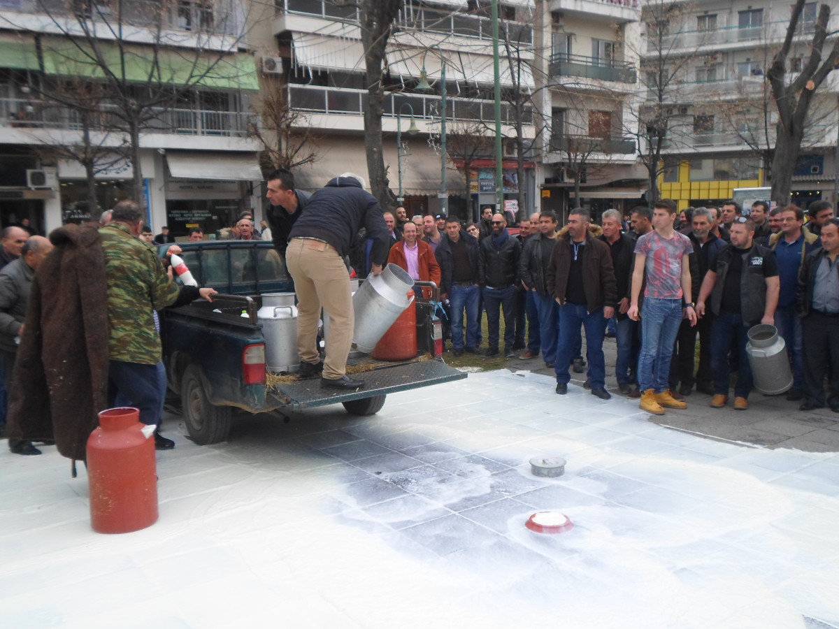 Κατά τη σημερινή κινητοποίηση οι κτηνοτρόφοι έριξαν γάλα στην Πλατεία Νομαρχίας, ενώ μοίρασαν ποσότητες σε διερχόμενους Λαρισαίους.