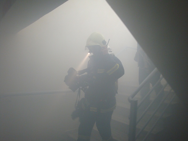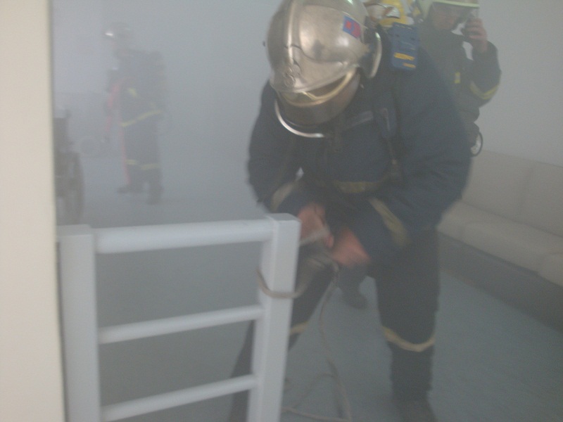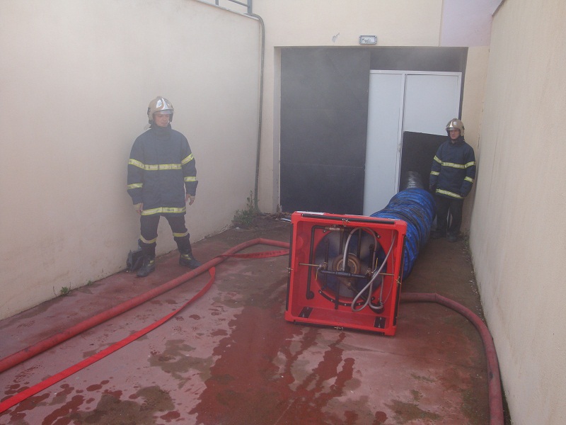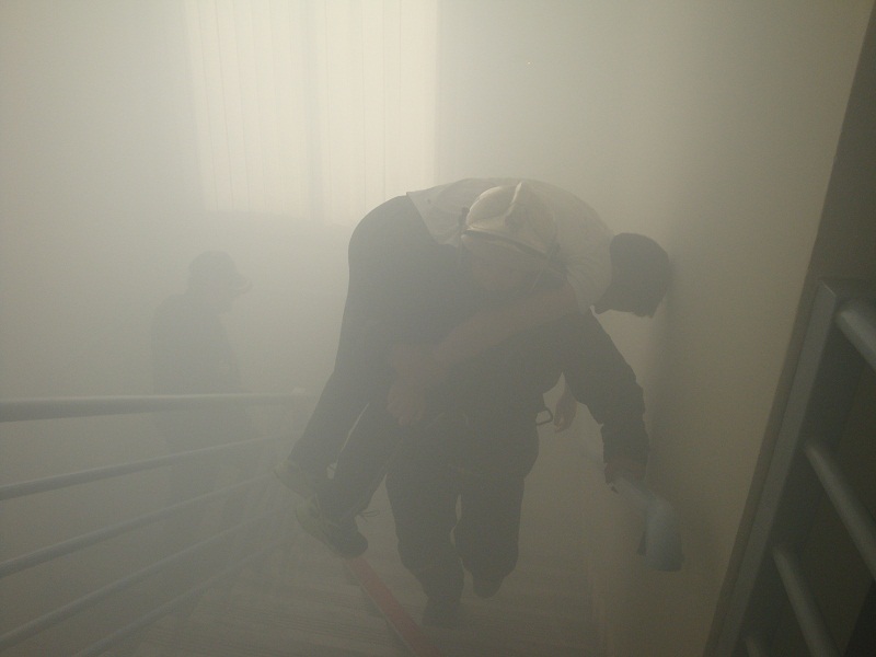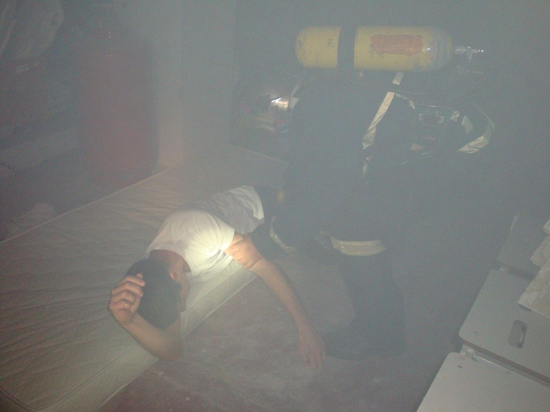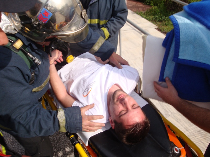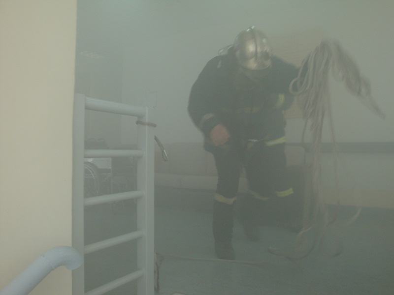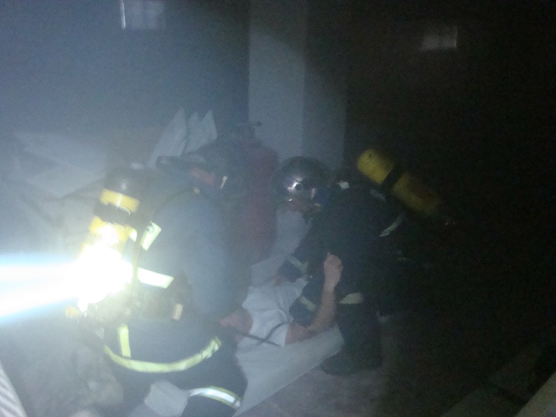 5.Με την άφιξη των δυνάμεων στο χώρο του συμβάντος και αφού η ομάδα πυρασφαλείας του κέντρου αποκατάστασης είχε προβεί στην εκκένωση της Β΄ πτέρυγας από προσωπικό και ασθενείς οι πυροσβεστικές δυνάμεις προχώρησαν στον εντοπισμό του εγκλωβισμένου ατόμου μέσω θερμικής κάμερας και στον απεγκλωβισμό και διάσωση αυτού και την μεταφορά του εκτός του κτηρίου σε ασφαλές μέρος ενώ παράλληλα έγινε κατάσβεση της πυρκαγιάς μετά από ταυτόχρονη ρίψη νερού από τα πληρώματα όλων των οχημάτων.