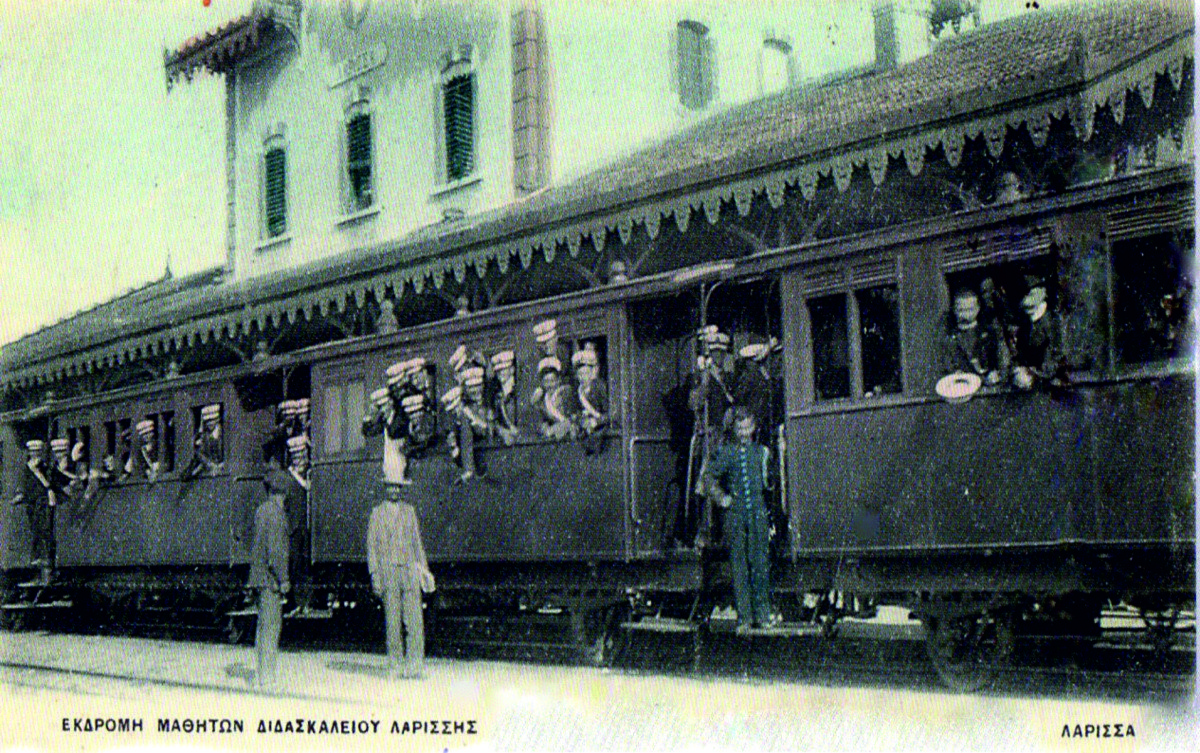 Οι σπουδαστές του Διδασκαλείου στα βαγόνια του Θεσσαλικού Σιδηροδρόμου, έτοιμοι να αναχωρήσουν για την εκδρομή τους στα παράλια του Παγασητικού. Επιστολικό δελτάριο των Πάλλη-Κοτζιά. Περίπου 1902.