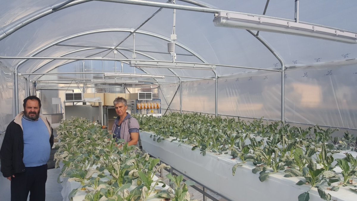 Ο Αναπληρωτής καθηγητής Γεωπονίας Κωνσταντίνος Πετρωτός και η Διδάκτωρ Γεωπονίας Χρυσούλα Παπαϊωάννου στο θερμοκήπιο, όπου εφαρμόζεται η αεροπονική μέθοδος στα πρότυπα της ΝΑSΑ και παραγάγουν λαχανικά κατά του σακχάρου
