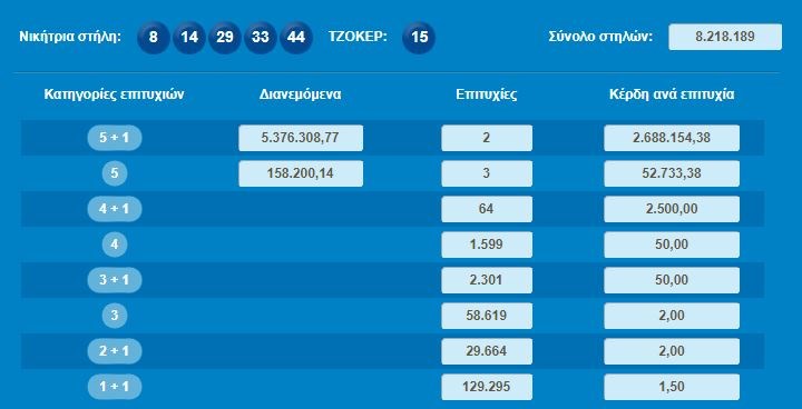 Επίσης, τρία τυχερά δελτία βρέθηκαν στην 2η κατηγορία που κερδίζουν το ποσό των € 52.733,38 το καθένα.