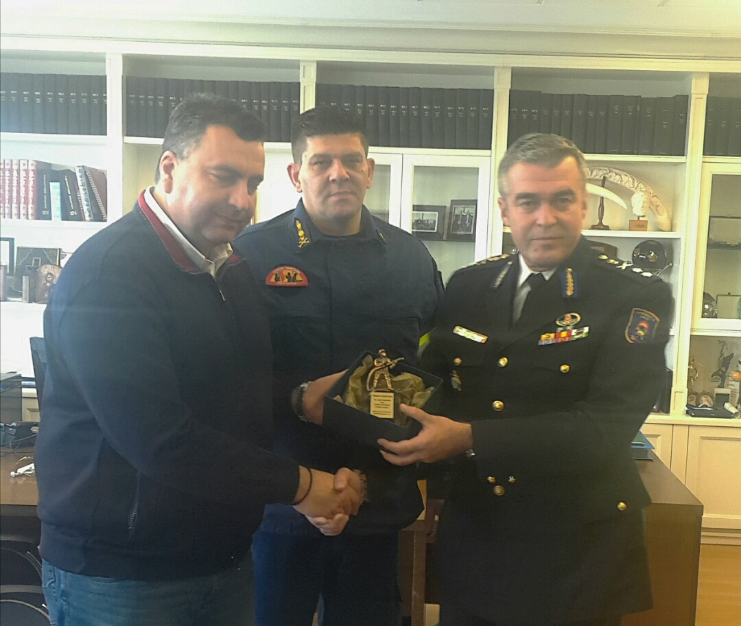 Ο κ. Τζουβάρας, παρουσία και του προέδρου του σωματείου πυροσβεστών κ. Βασίλη Ρούντου, αφού τον ευχαρίστησε για τη συνεργασία και τη διαρκή συνεισφορά του στο Πυροσβεστικό Σώμα, του απένειμε τιμητικό πυροσβεστικό αγαλματίδιο.