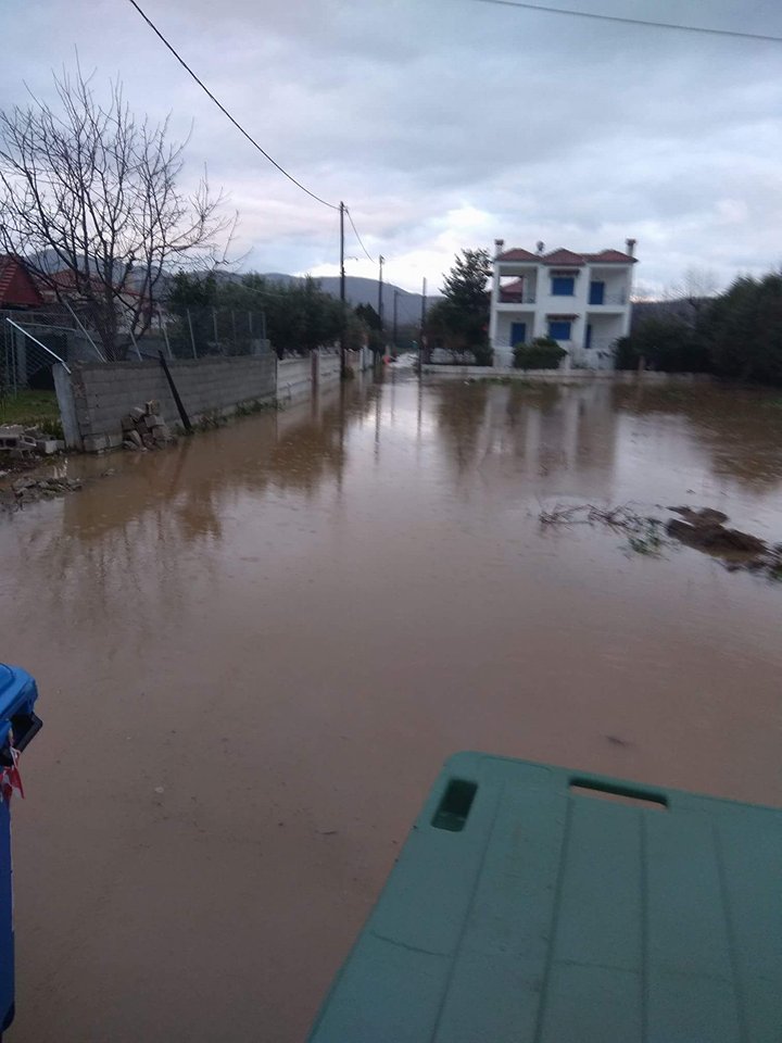 Ενδεικτικά φαίνεται από τα στιγμιότυπα πως τα νερά διαπερνούν αυλές και έχουν συγκεντρωθεί σε οικόπεδα κλπ.