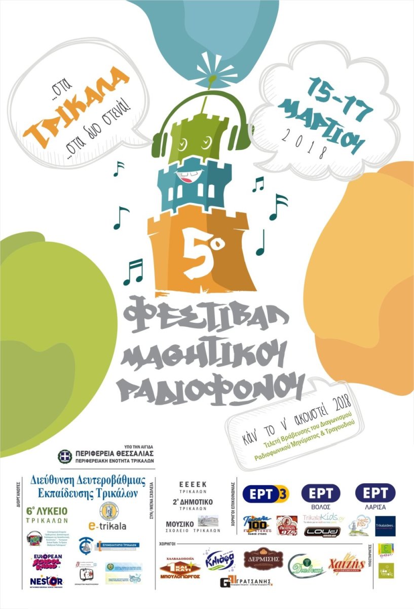 Το 6o Γενικό Λύκειο με την αμέριστη συμπαράσταση των συνδιοργανωτών του, εκπονεί το 5ο Πανελλήνιο Φεστιβάλ Μαθητικού Ραδιοφώνου από 15 έως 17 Μαρτίου 2018. Το Φεστιβάλ διοργανώνεται από την Επιστημονική Εταιρεία του European School Radio και το υποστηρίζουν οργανωτικά οι ακόλουθοι φορείς: Η Διεύθυνση Δ/μιας Εκπ/σης Ν. Τρικάλων με την ένθερμη συμπαράσταση της Δ/ντριας,κας Κάκλα Βασιλικής και των Υπευθύνων των Σχολικών Δραστηριοτήτων και του ΚΕ.ΠΛΗ.ΝΕΤ της Δ/μιας Εκπ/σης Ν. Τρικάλων. ο Δήμος Τρικκαίων, η Αναπτυξιακή Εταιρεία e-trikala.