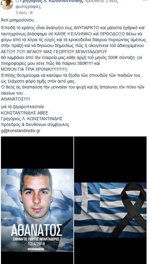 Με μηνιαία σύνταξη 500 ευρώ και κάλυψη των εξόδων των σπουδών των παιδιών του αδικοχαμένου πιλότου μας στηρίζουν τα ζαχαροπλαστεία Κωνσταντινίδη την οικογένεια Γ. Μπαλταδώρου.