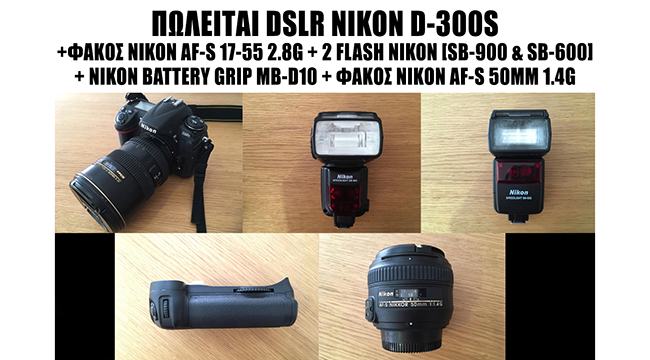 Πωλείται DSLR Nikon D-300s με 2 φακούς (Nikon AF-S 17-55 2.8G & Nikon AF-S 50mm 1.4G), 2 flash Nikon (SB-900 & SB-600) και battery grip Nikon MB-D10.