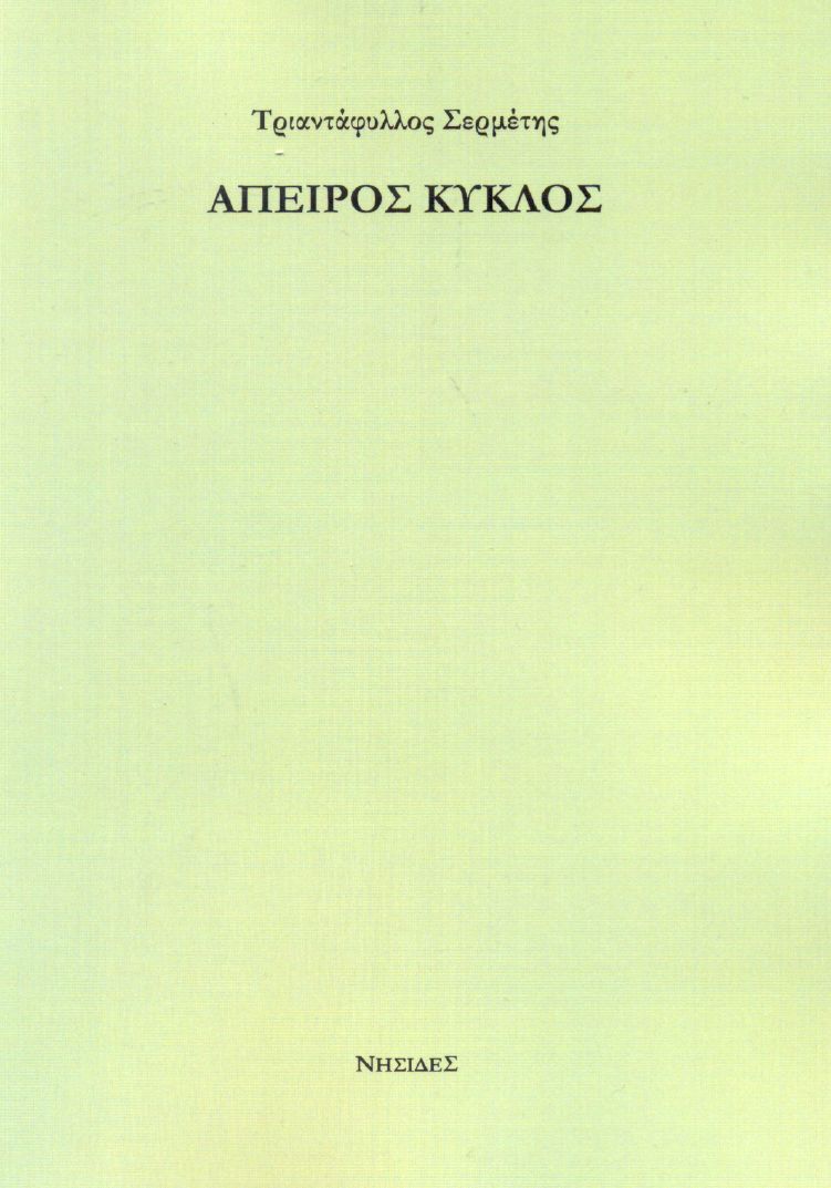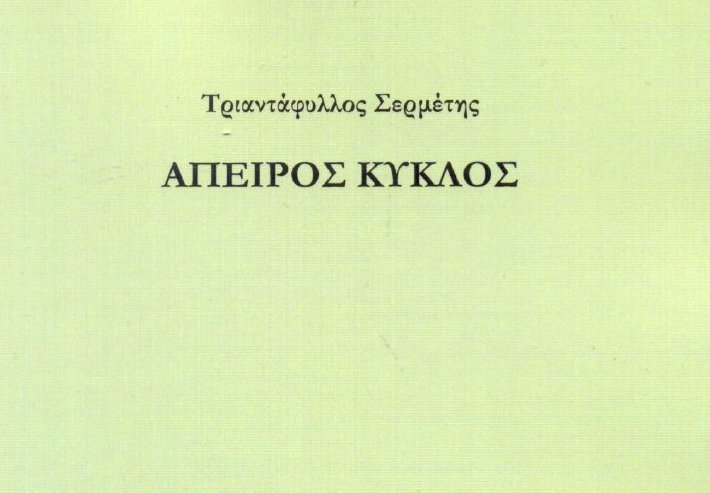 Πριν μερικές ημέρες εκδόθηκε η νέα Ποιητική Συλλογή του Τριαντάφυλλου Σερμέτη με τον τίτλο “Άπειρος Κύκλος” από τις εκδόσεις «Νησίδες». Η θεματολογία της διερευνά με ποιητικό τρόπο την αγωνία και την ανησυχία του ποιητή για τη Γέννηση, τον Θάνατο, τον Έρωτα, το κοινωνικό και πολιτικό γίγνεσθαι και το στίγμα της ανθρώπινης ύπαρξη, καθώς αυτή πορεύεται μέσα στον χρόνο.