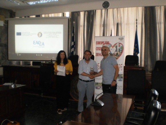 Τέλος, την τελευταία ημέρα της συνάντησης πραγματοποιήθηκε στην Αίθουσα του Δημοτικού Συμβουλίου Λάρισας προβολή ταινιών μικρού μήκους με θέμα την αλληλεγγύη των χωρών και την καταπολέμηση των πάσης φύσεως διακρίσεων ενώ ακολούθησε η παράδοση αναμνηστικών πλακετών από τον Αντιδήμαρχο Τεχνικών Έργων, Υποδομών και Πολιτικής Προστασίας κο. Γιώργο Σούλτη προς τους συμμετέχοντες εταίρους.
