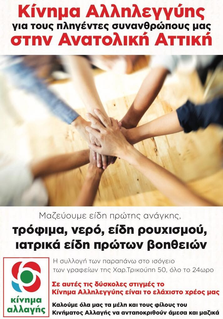 «Με τις απώλειες σε ανθρώπινες ζωές να είναι δραματικές και τις περιβαλλοντικές και υλικές καταστροφές ανυπολόγιστες, από τις πυρκαγιές στην Ανατολική Αττική, σε αυτές τις δύσκολες στιγμές για τους συμπολίτες μας, με σκοπό τη μέγιστη δυνατή συνεισφορά μας, καλούμε τα μέλη και τους φίλους του Κινήματος Αλλαγής αλλά και όσους πολίτες επιθυμούν να συνεισφέρουν να συλλέξουμε: