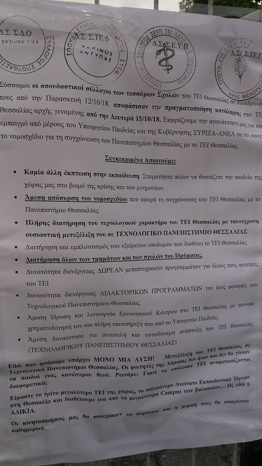 Ένα από τα βασικά τους αιτήματα είναι η απόσυρση του νομοσχεδίου για τη συγχώνευση του ΤΕΙ με το Πανεπιστήμιο Θεσσαλίας.