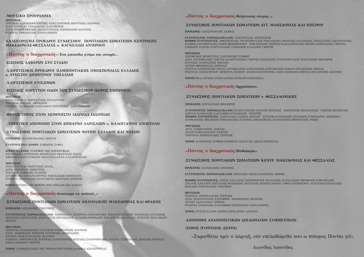 Σήμερα σε συνέντευξη τύπου που παραχωρήθηκε από τον αντιδήμαρχο Πολιτισμού Πάνο Σάπκα και το Χρήστο- Δημήτριο Τοπαλίδη, Πρόεδρος Πανποντιακής Ομοσπονδίας Ελλάδος και πρόεδρος του συλλόγου Ποντίων Λάρισας τονίστηκε η σημαντικότητα του φεστιβάλ που ανάλογό του δεν υπάρχει στη Ελλάδα. Το 14ο φεστιβάλ της Ομοσπονδίας είναι αφιερωμένο στη μνήμη του Λεωνίδα Ιασονίδη, στον σπουδαίο πολιτικό και αντιπρόσωπο του ποντιακού ελληνισμού, που σε όλη του τη ζωή αγωνίστηκε για την ελευθερία και αποκατάσταση των Ποντίων.
