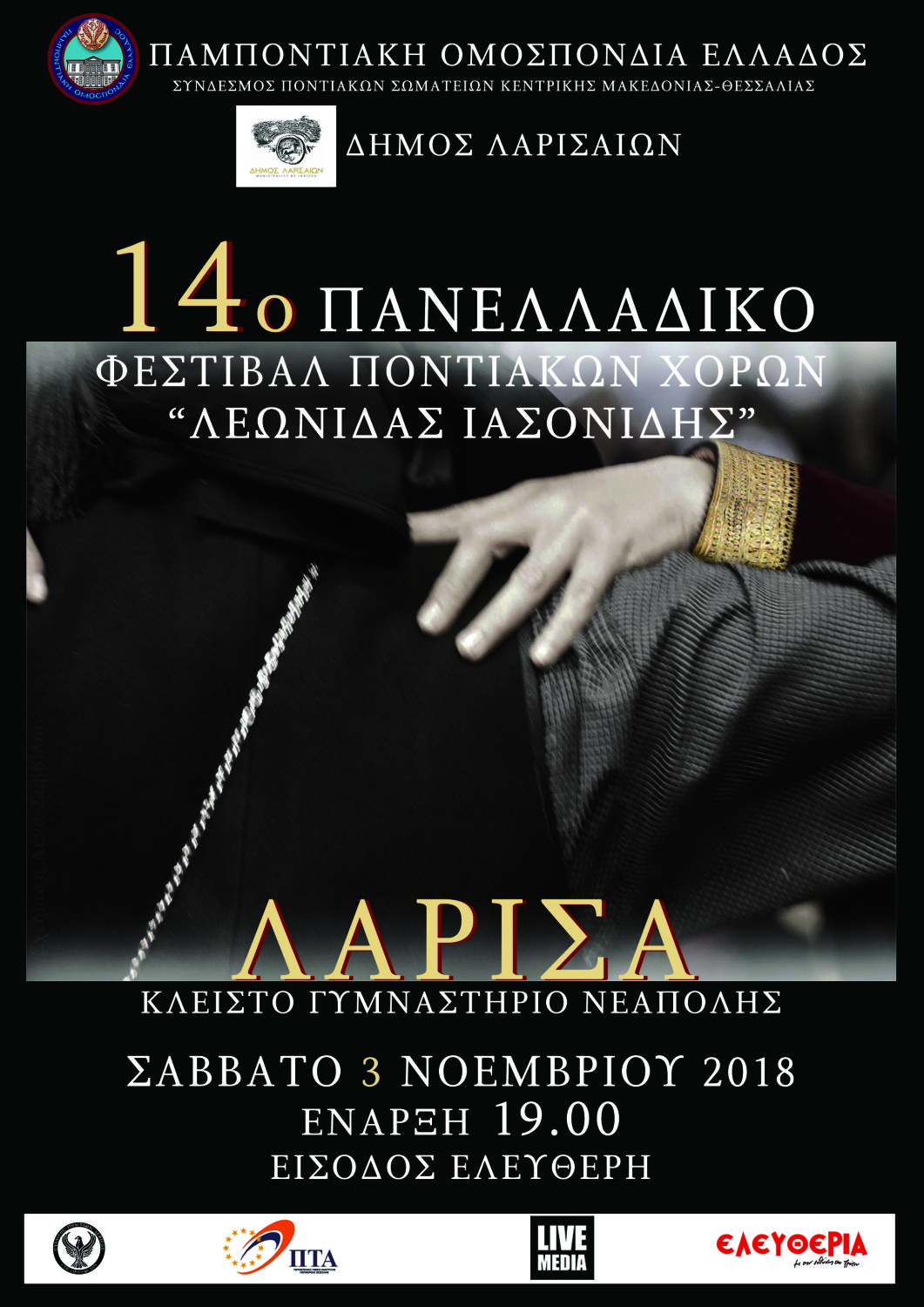 Οι λάτρεις της παράδοσης θα έχουν την ευκαιρία να παρακολουθήσουν στη Λάρισα το 14ο Πανελλαδικό Φεστιβάλ Ποντιακών Χορών, το Σάββατο 3 Νοεμβρίου στο Κλειστό Γυμναστήριο Νεάπολης. Πρόκειται για ένα εντυπωσιακό φεστιβάλ στο οποίο θα συμμετέχουν 2.500 χορευτές και 100 μουσικοί, μέλη των Δ.Σ., των 460 Ποντιακών Σωματείων μελών της Παμποντιακής Ομοσπονδίας Ελλάδος, από ολόκληρη την ελληνική επικράτεια. Το φεστιβάλ ξεκινά στις 7 το απόγευμα όμως από μια ώρα νωρίτερα θα υπάρχει μια συναυλία με μεγάλα ονόματα του ποντιακού πενταγράμμου. Όσοι βρεθούν στο φεστιβάλ θα έχουν την δυνατότητα να παρακολουθήσουν κι άλλες εκπλήξεις.