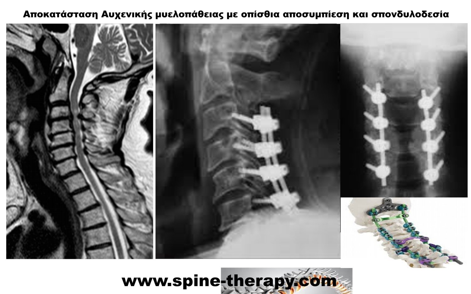 - Οπίσθια αυχενική αποσυμπίεση με πεταλεκτομή και οπίσθια σπονδυλοδεσία με μικρο-κοχλίες και μικρο-ράβδους με ρομποτική καθοδήγηση. Ο χρόνος της χειρουργικής επέμβασης είναι συνήθως 2-3 ώρες, οι ασθενείς περπατάνε άμεσα 2 ώρες μετά την επέμβαση ενώ μπορούν να πάρουν εξιτήριο την επόμενη ημέρα χωρίς αυχενικό κολάρο.
