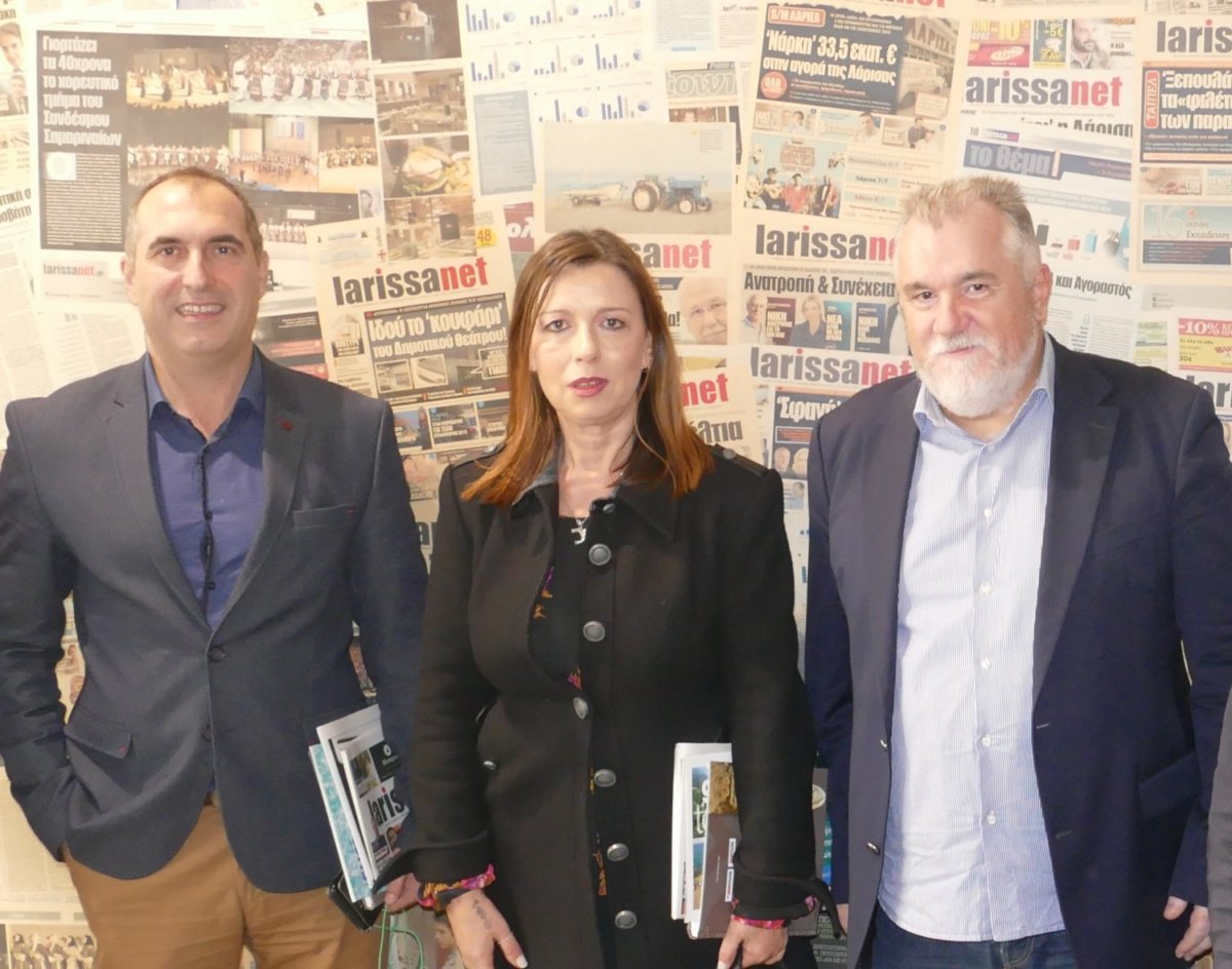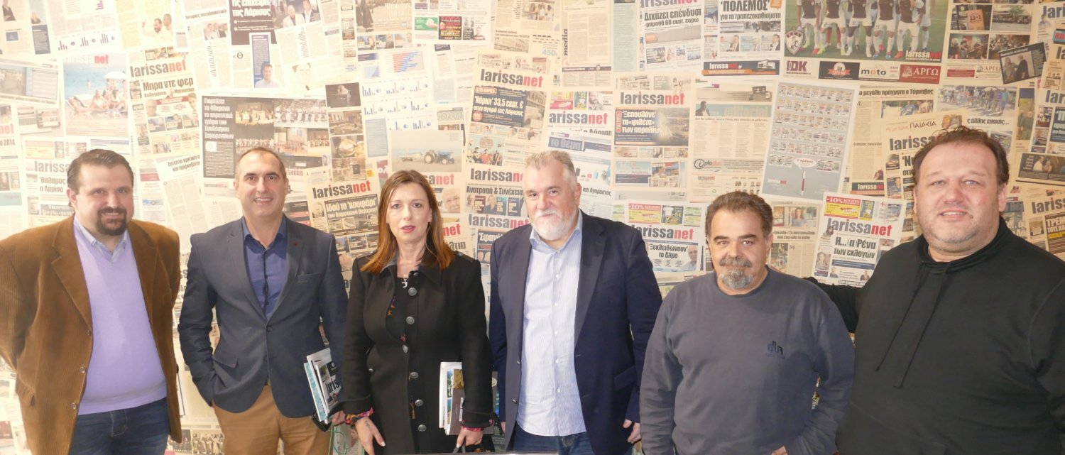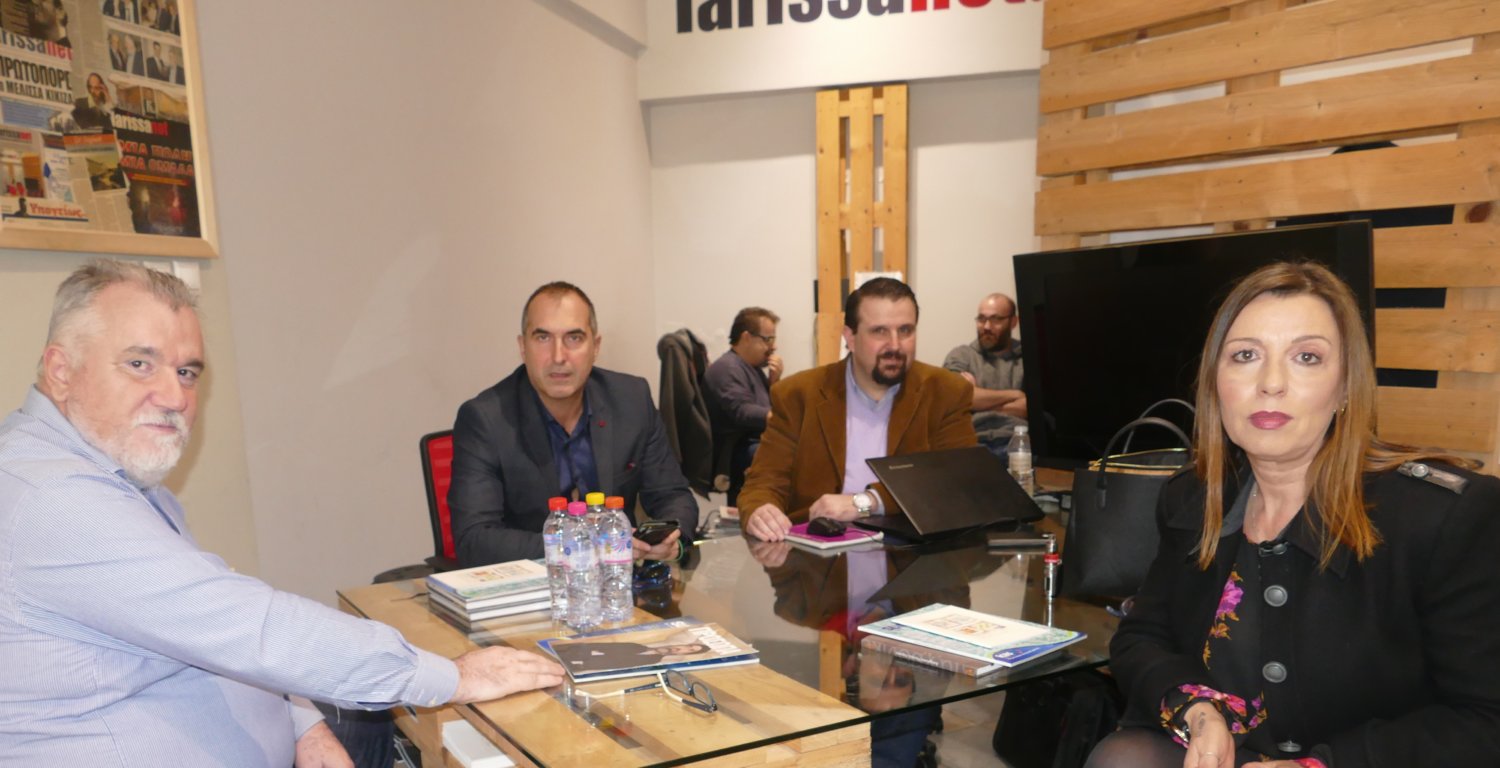 Τα γραφεία της larissanet επισκέφθηκαν σήμερα ο πρόεδρος της Ένωσης Συντακτών Ημερησίων Εφημερίδων Θεσσαλίας, Στερεάς Ελλάδας και Εύβοιας (ΕΣΗΕΘΣτΕΕ) κ. Δημήτρης Χορταργιάς και η πρόεδρος της Πανελλήνιας Ομοσπονδίας Ενώσεων Συντακτών (Π.Ο.Ε.ΣΥ) κα Έλενα Ριζεάκου και συζήτησαν για θέματα του περιφερειακού Τύπου με τον εκδότη – διευθυντή της εφημερίδας μας Χρήστο Μπεχλιβάνο και δημοσιογράφους της larissanet.