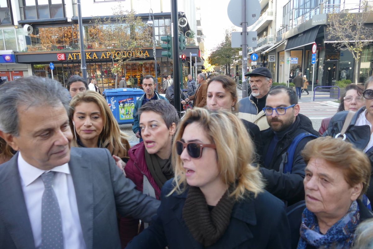Φωτογραφικό στιγμιότυπο κατά την έξοδο της κόρης, της πεθεράς και του συνηγόρου της 53χρονης καθαρίστριας από το Δικαστικό Μέγαρο Λάρισας