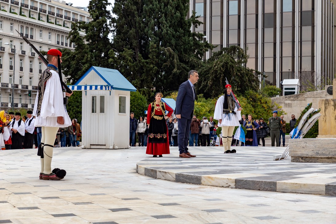 Στη συνέχεια πραγματοποιήθηκε πομπή παραδοσιακών αγημάτων η οποία κατέληξε στο Μνημείο «Άγνωστου Στρατιώτη» στην πλατεία Συντάγματος, όπου και ακολούθησε κατάθεση στεφάνων από τους: Πρόεδρο «Πανθεσσαλικής Στέγης» Δρ. Στέφανος Κούτρας, Πρόεδρο της ΠΕΔ Θεσσαλίας και Δήμαρχος Μουζακίου κ. Γιώργος Κωτσός, Δήμαρχος Καρδίτσας Φώτης Αλεξάκος, επί τιμή εκ μέρους των ακριτικών συλλόγων των Θεσσαλών η Πρόεδρος των Συλλόγων Θεσσαλών Φλώρινας κ. Αγαθή Οικονόμου.