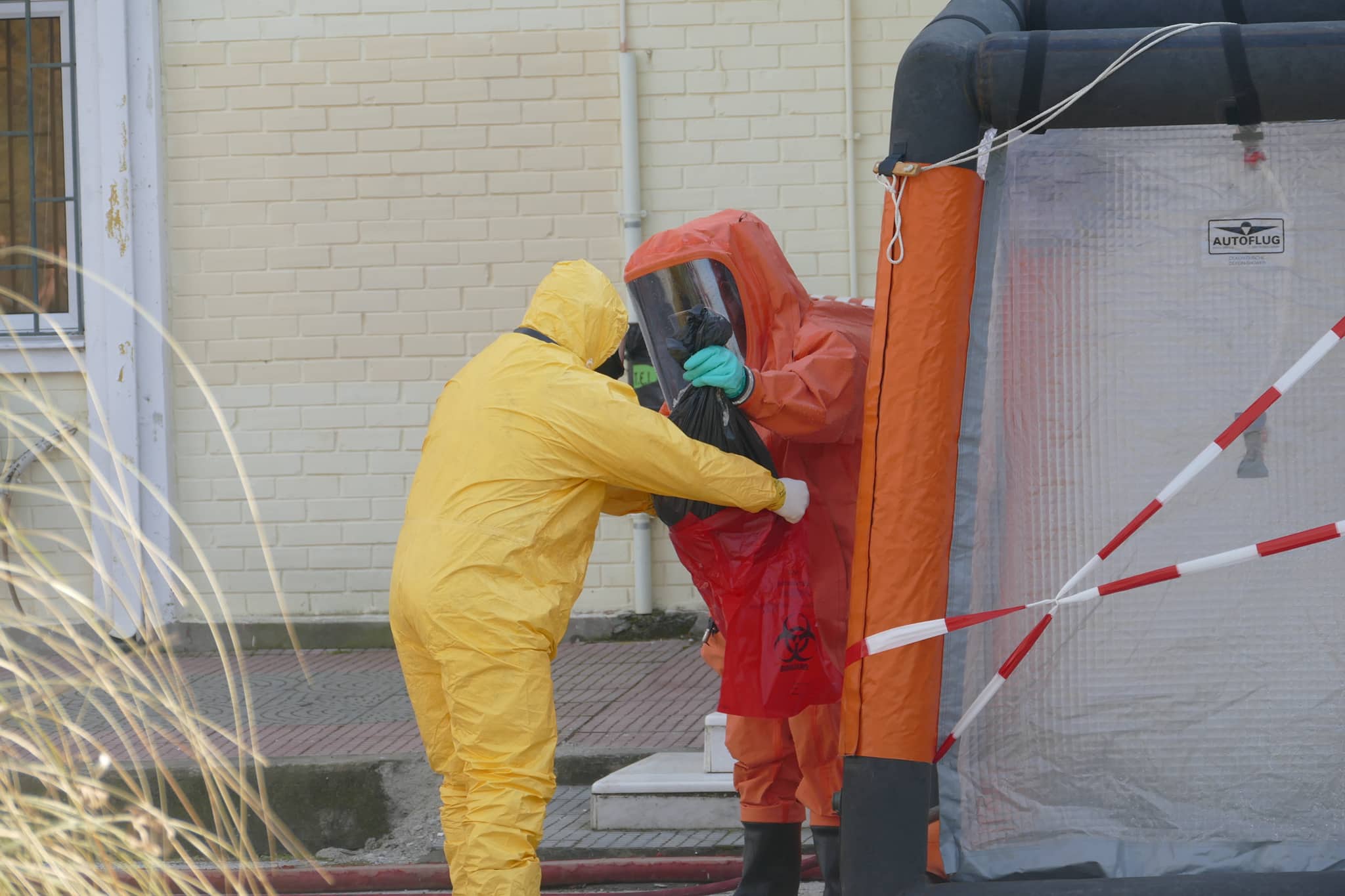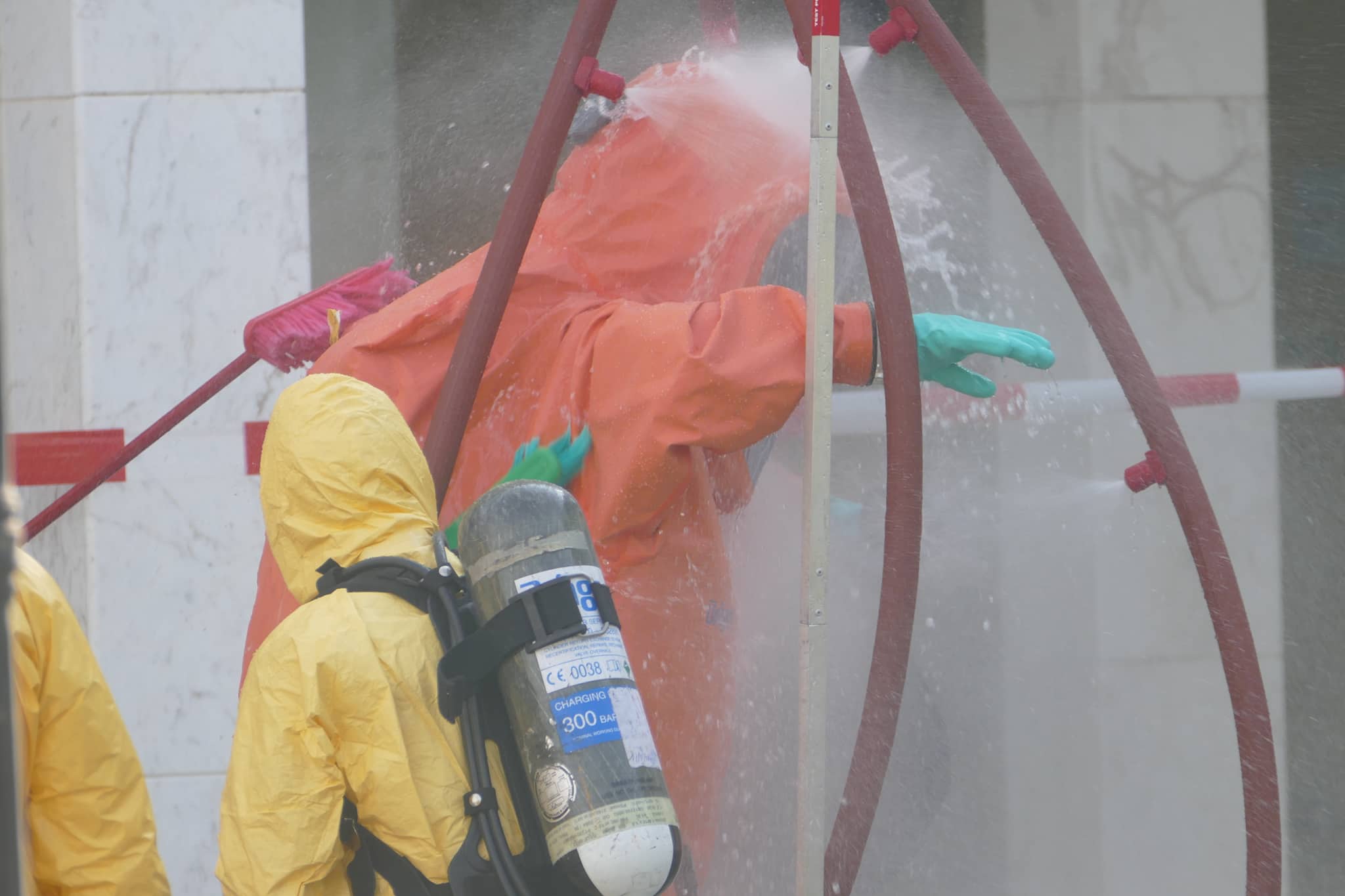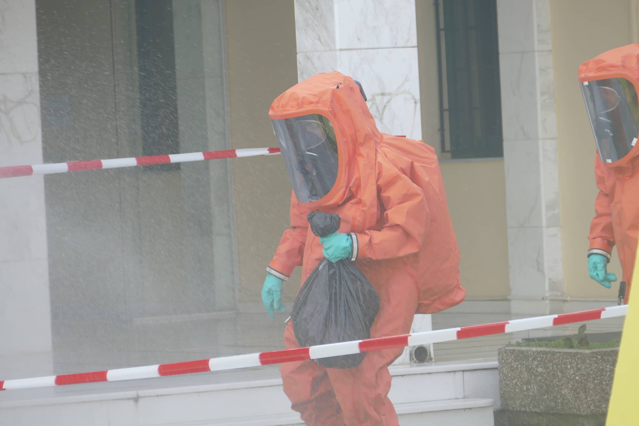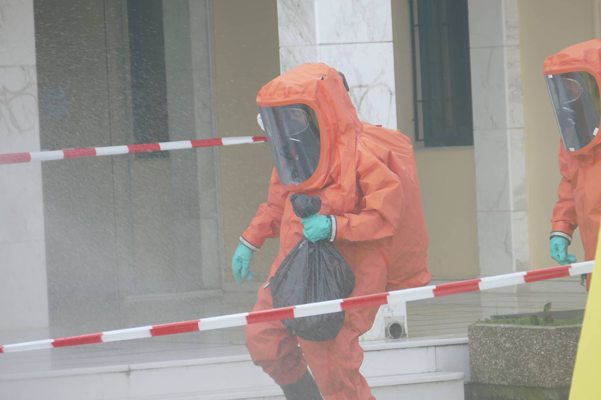 Το στέλεχος κρατώντας τη σακούλα με το φάκελο πέρασε από «ντουζιέρα» για την πρώτη φάση της απολύμανσης.