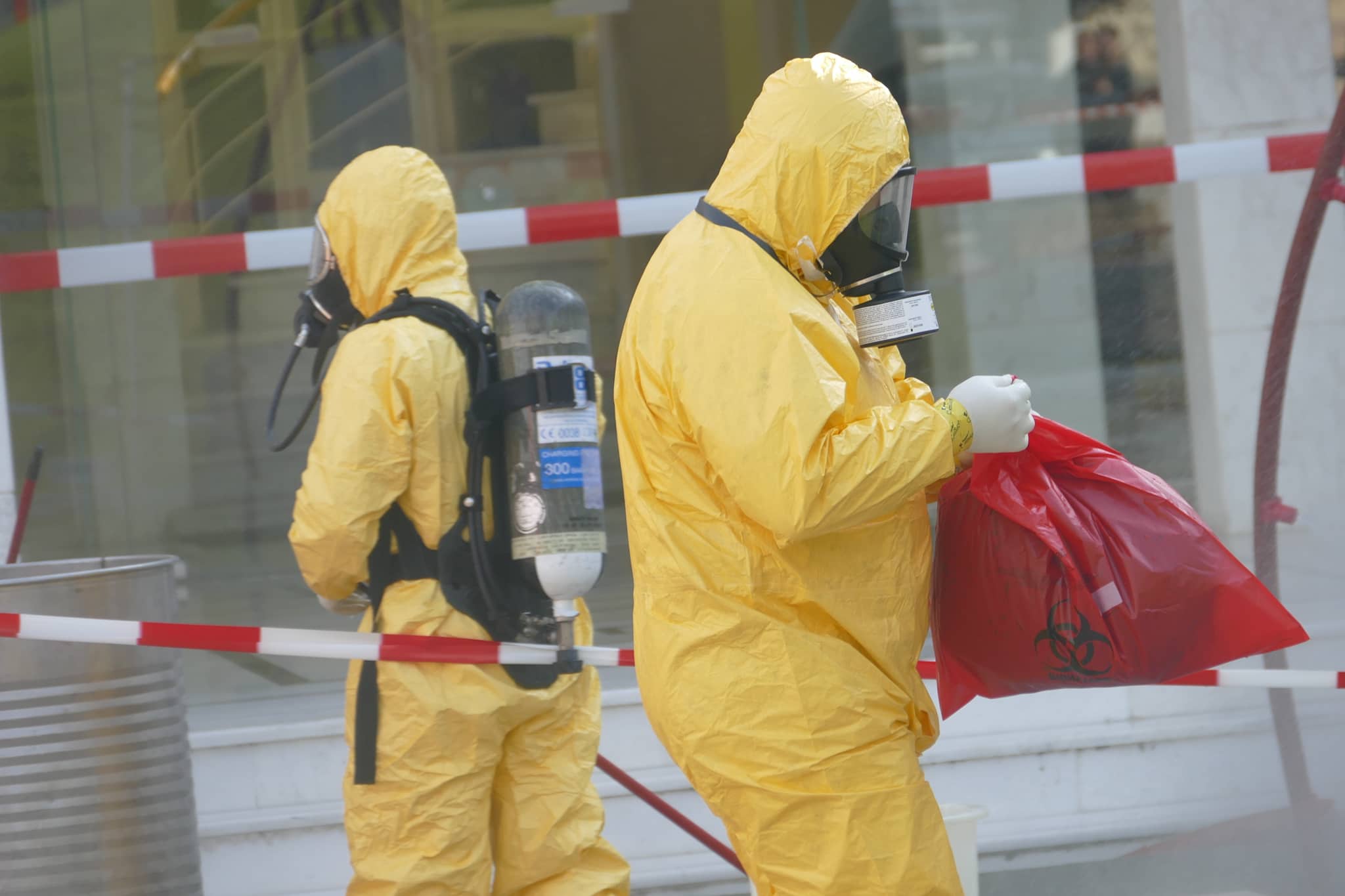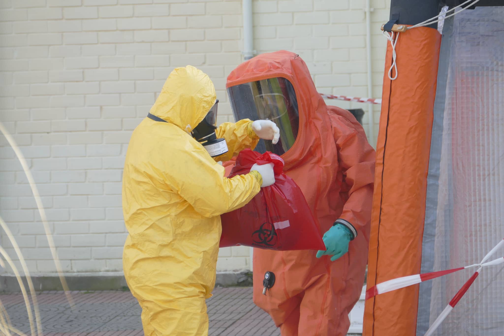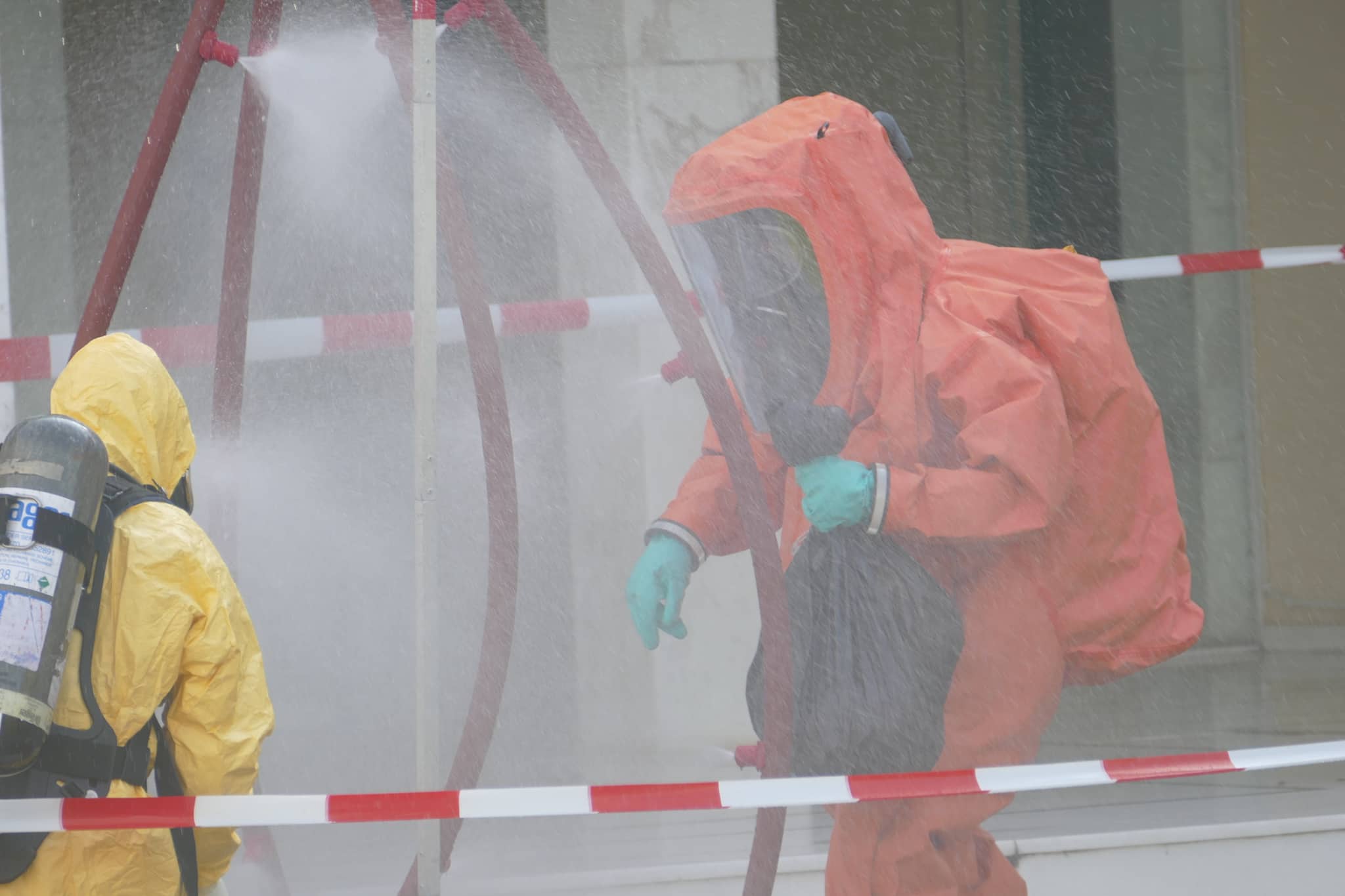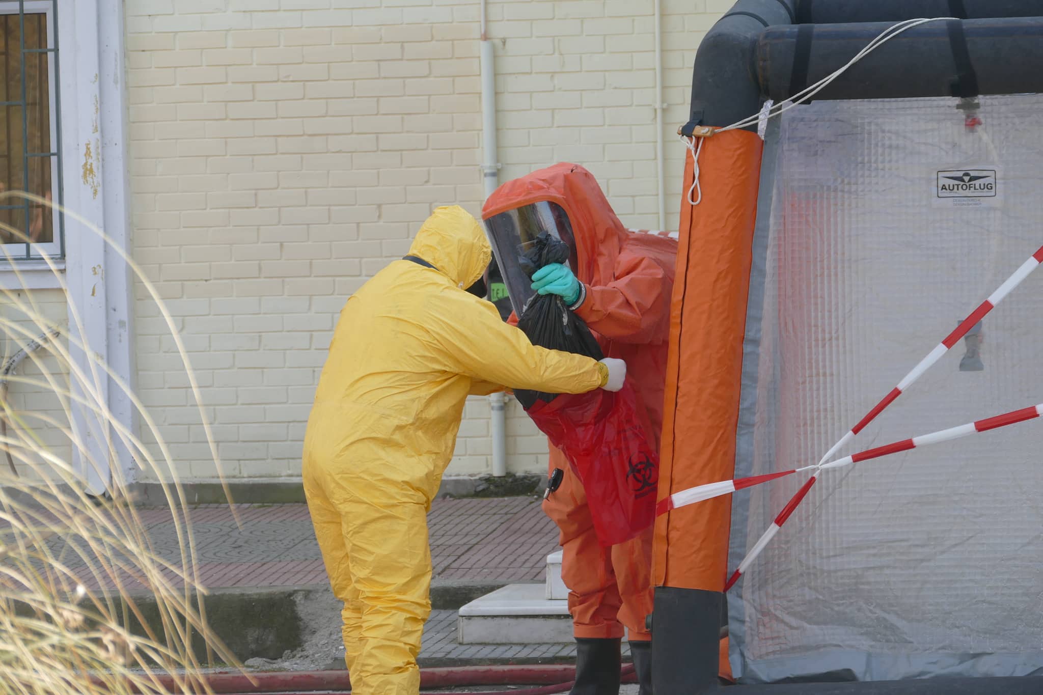 Το στέλεχος κρατώντας τη σακούλα με το φάκελο πέρασε από «ντουζιέρα» για την πρώτη φάση της απολύμανσης.