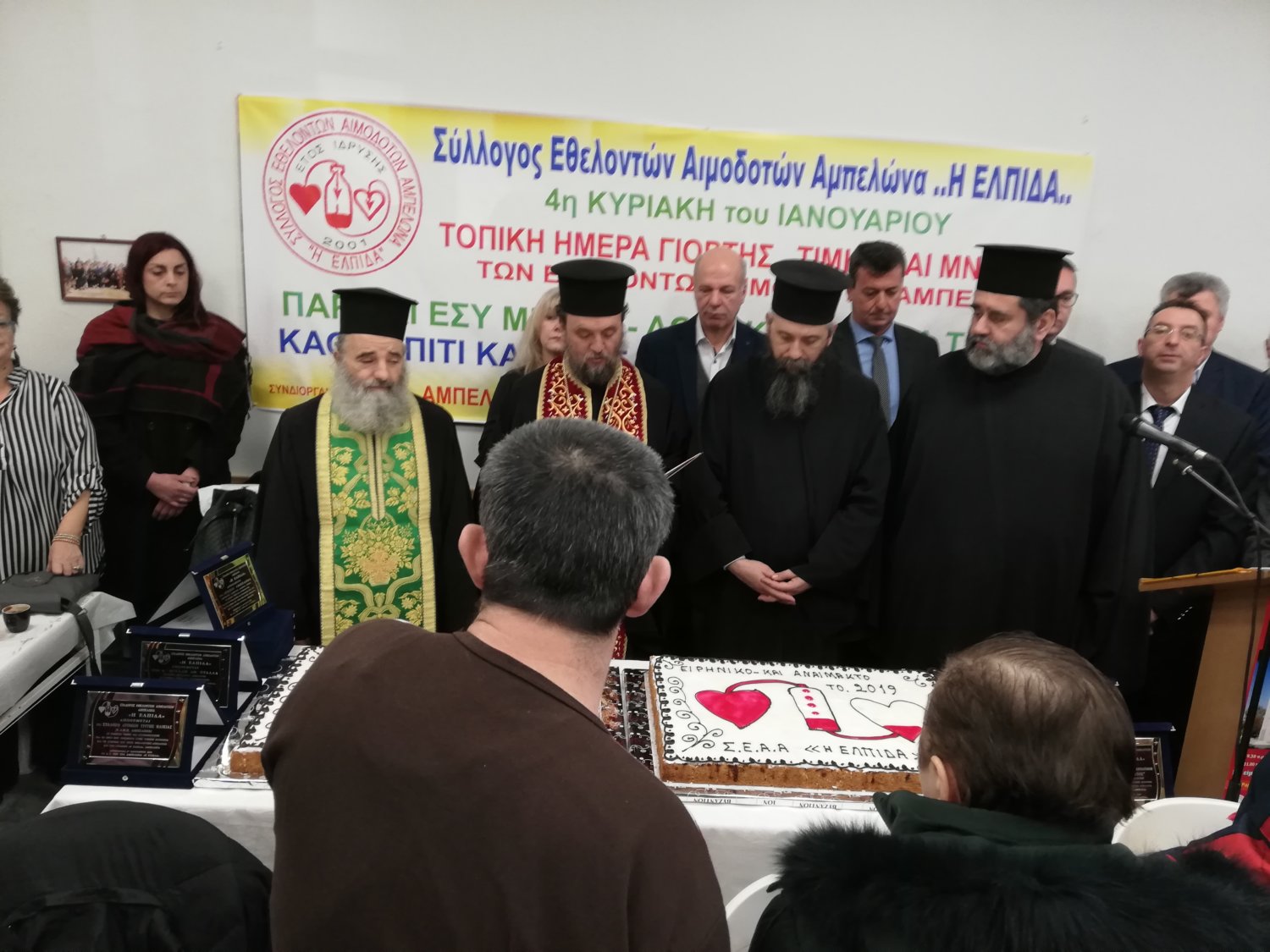 Σε μία εξαιρετική εκδήλωση στην αίθουσα στο ΚΑΠΗ του Αμπελώνα πραγματοποιήθηκε η Ημέρα τιμής και μνήμης εθελοντών αιμοδοτών από το σύλλογο «Ελπίδα» στον Αμπελώνα, την Κυριακή 27 Ιανουαρίου 2019.