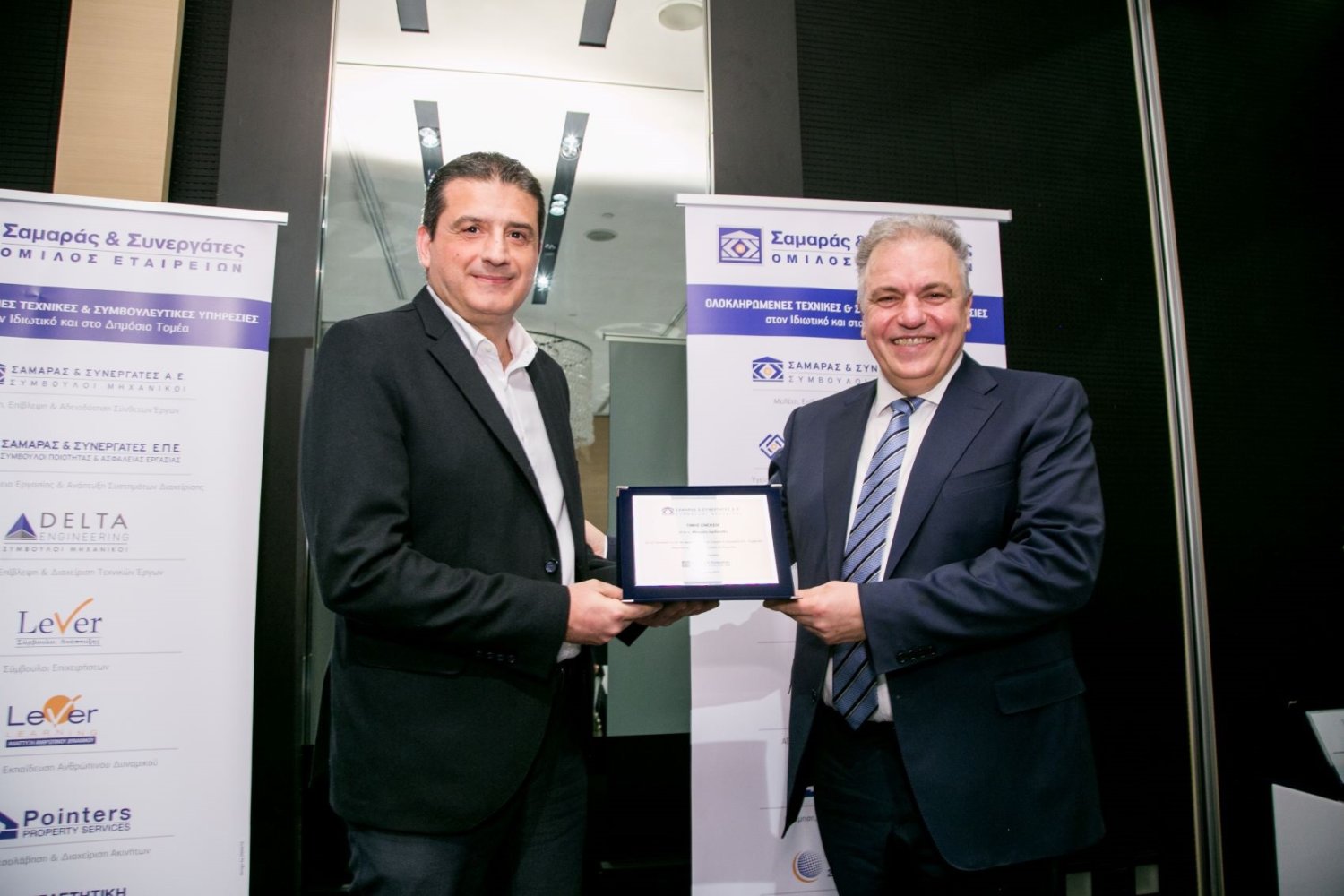 Η Διοίκηση και οι 280 συνεργάτες –Θεσσαλονίκης και Αθηνών- συμμετείχαν στην εκδήλωση, που «άνοιξε» με την ομιλία του, ο πρόεδρος του Ομίλου, Δημήτρης Σαμαράς: «Αγαπημένοι μου συνεργάτες, αγαπημένοι μου συνέταιροι, αλλά και συμμέτοχοι και συνοδοιπόροι της κοινής μας πορείας, κοιτάζοντάς σας όλους σήμερα εδώ, δεν γίνεται να μη σκεφτώ, πως, και από που, ξεκίνησε όλη αυτή διαδρομή, τότε, πριν από 27 χρόνια σ’ ένα μικρό γραφείο, στη ιστορική οδό Αγίου Μηνά στον αριθμό 7 στο κέντρο της πόλης μας, με δύο – τρεις τότε συνεργάτες. Από δύο – τρεις λοιπόν συνεργάτες τότε, σήμερα είμαστε εδώ περίπου 300! Και αν προσθέσουμε και τους εξωτερικούς μας συνεργάτες συνολικά είμαστε περίπου 450 επιστήμονες, που καθημερινά υποστηρίζουμε την επιχειρηματικότητα, αλλά και την ανάπτυξη στη χώρα μας. Αν ζούσαμε σε μια πιο οργανωμένη χώρα, η οποία θα εκτιμούσε αυτό που κάνουμε, θα έπρεπε να μας βραβεύσουν, γιατί αναχαιτίζουμε τη φυγή των επιστημόνων και δη των μηχανικών στο εξωτερικό, το επονομαζόμενο Brain – drain, διασφαλίζοντας έτσι και τη συνοχή της ελληνικής οικογένειας».