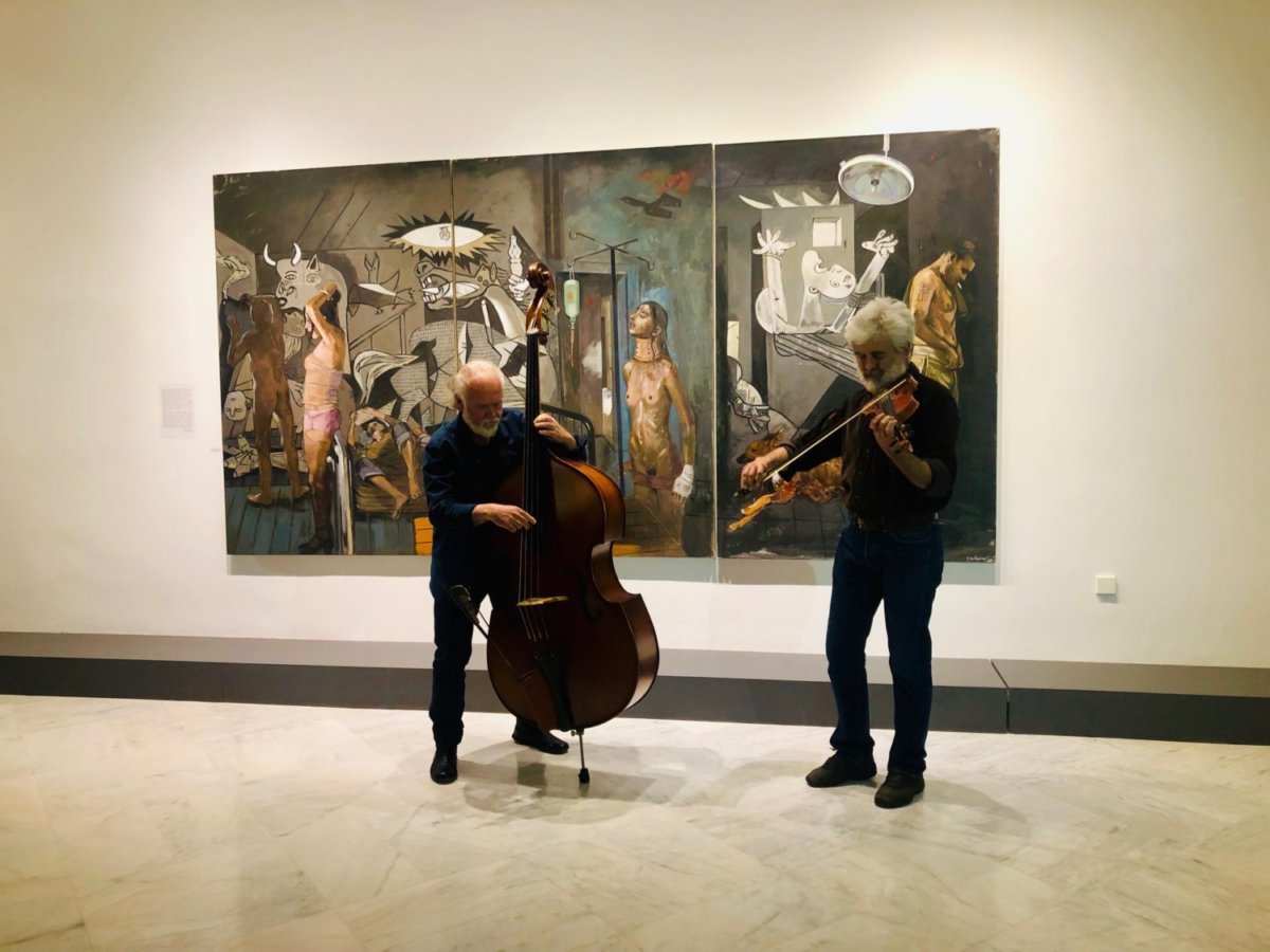 Η ξενάγηση ξεκίνησε με μία μουσική performance από τους μουσικούς που απαρτίζουν το σχήμα Arc Duo, Χρήστο Παπαγεωργίου (βιολί) και Γιώργο Κωστούλη (κοντραμπάσο-φωνητικά) όπου αυτοσχεδίασαν ζωντανά, εξερευνώντας το προσωπικό, συλλογικό, συνειδητό-ασυνείδητο νόημα του εμβληματικού τρίπτυχου της έκθεσης ζωγραφικής «Αναφορά στην Γκουέρνικα» του Κυριάκου Κατζουράκη. Σε μια προσπάθεια αναζήτησης συνδεσμολογιών μεταξύ εικόνας και ήχου. Η ιδέα για αυτή τη διάδραση προέκυψε από μια συζήτηση μεταξύ Κυριάκου Κατζουράκη και Γιώργου Κωστούλη με σημείο εκκίνησης το συγκεκριμένο εικαστικό έργο.