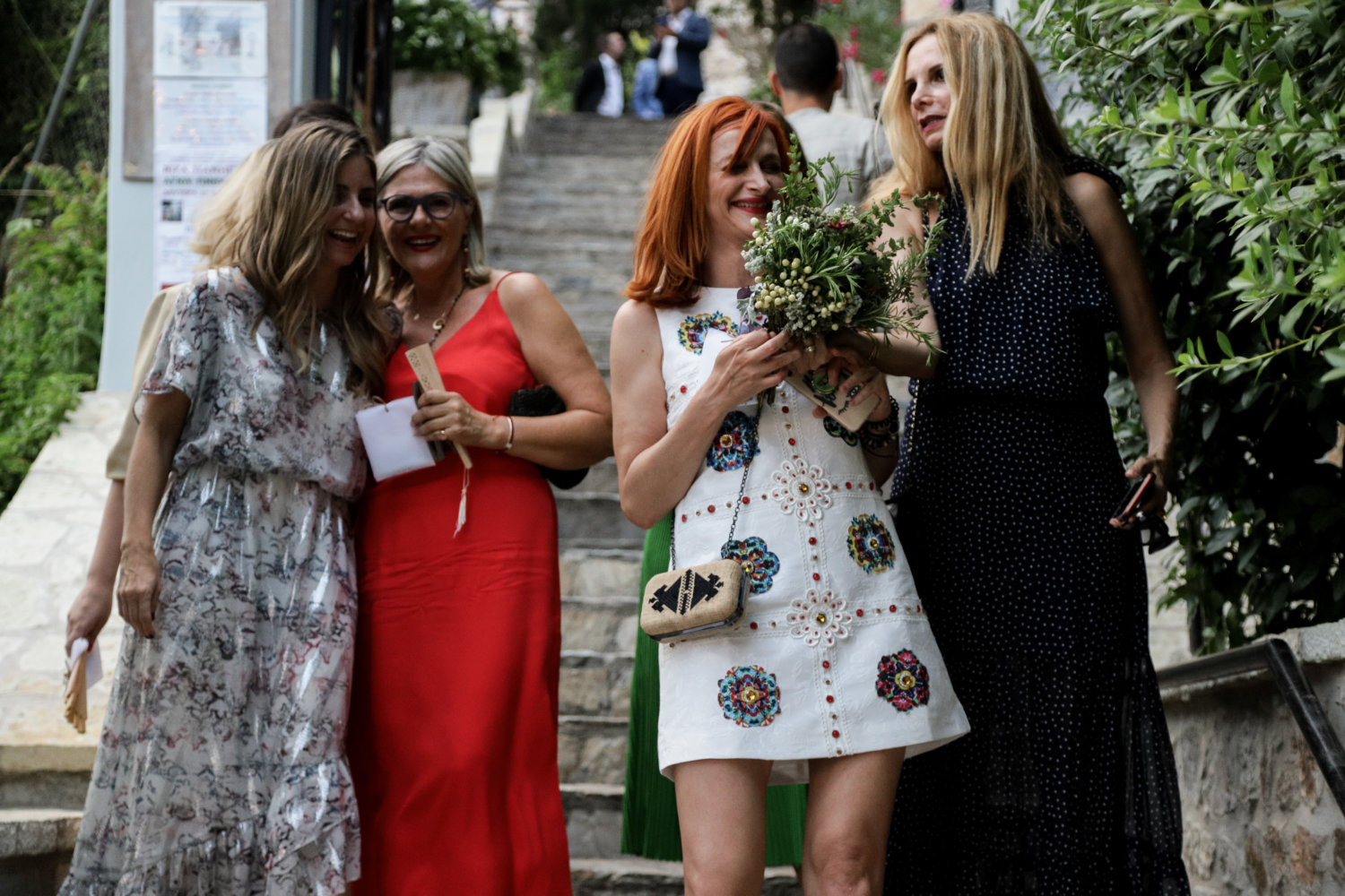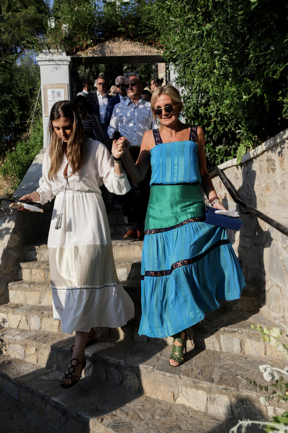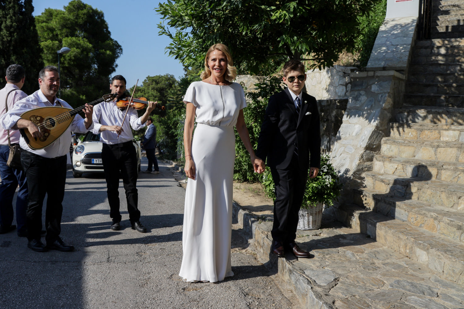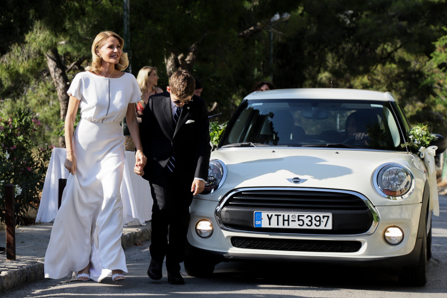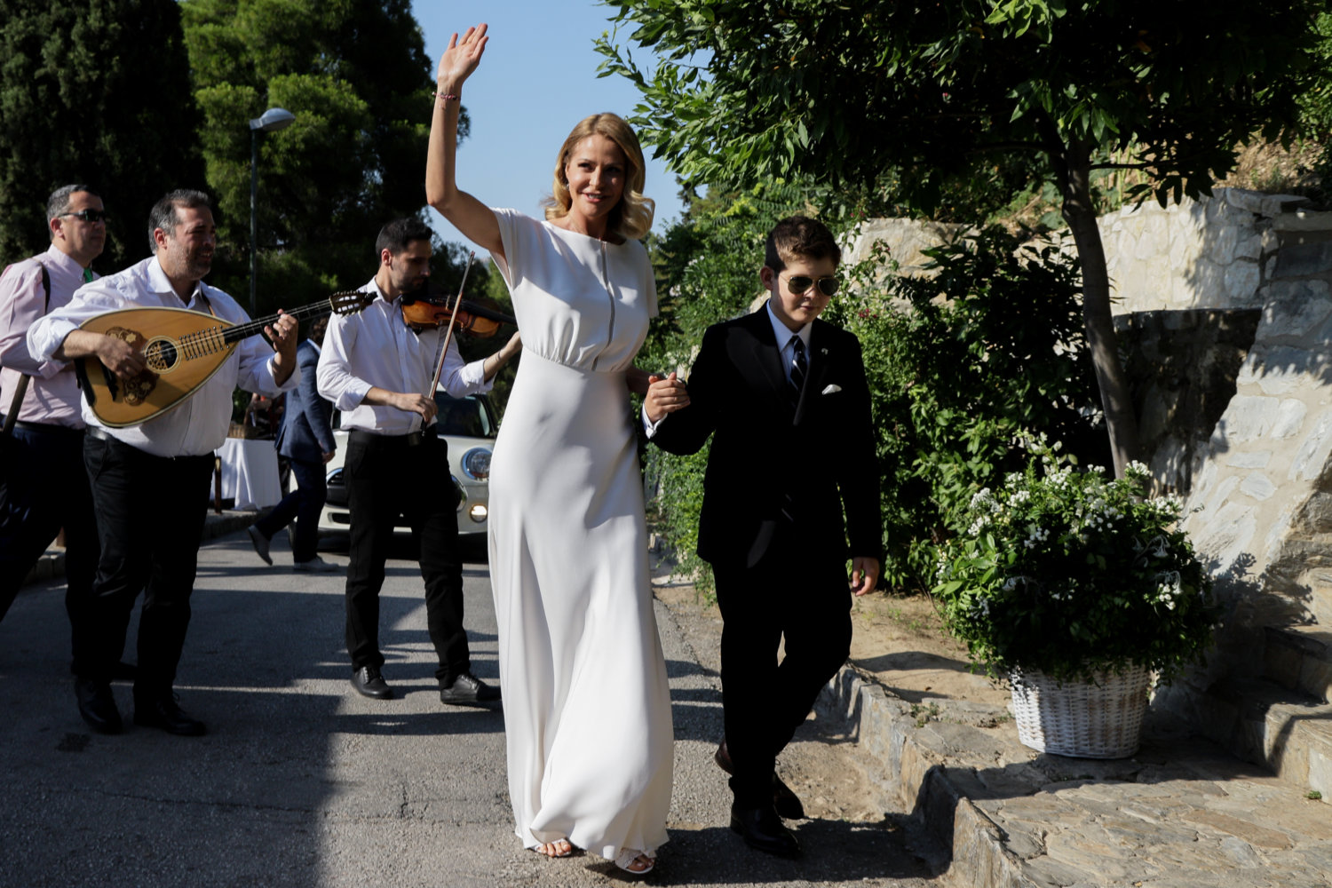 Την Τζένη Μπαλατσινού συνόδευσε στην εκκλησία ο γιος της Μάξιμος και η ίδια έλαμπε στο νυφικό που είχαν επιμεληθεί ο οίκος Zeus & Dione της Μαρέβας Μητσοτάκη.