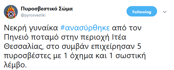Ανάρτηση στο twitter έκανε η Πυροσβεστική για το γεγονός της ανάσυρσης νεκρής γυναίκας από τον Πηνειό ποταμό, το πρωί της Κυριακής, στο ύψος της Ιτέας Λάρισας.