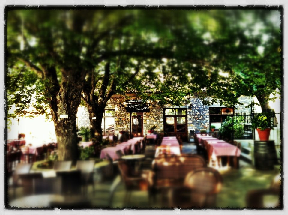 Φτάνοντας στη δροσερή πλατεία με τα αιωνόβια πλατάνια, ο επισκέπτης αντικρίζει τα περιποιημένα μαγαζιά, οι μυρωδιές τον κατακλύζουν… «Με βρήκε στην πλατεία να πίνω τσίπουρο και να παίζω τάβλι» περιγράφει ο Καραγάτσης!