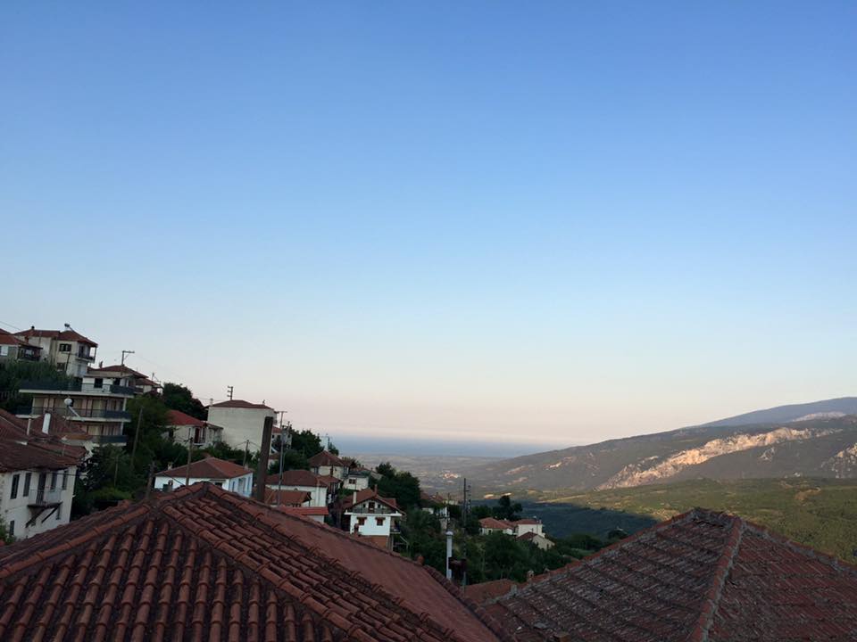 «Αγνάντεψα τον κάμπο. Απλωνόταν ως χίλια μέτρα κάτωθε μιας πλατύς, ισόπεδος, καρπερός, αρμονικά χωρισμένος σε βαθύχρωμα ποτιστικά χωράφια και μποστάνια ανοιχτοπράσινα. Ο Πηνειός τον έσκιζε φιδωτά, ανάμεσα στις λυγαριές, για να χυθή στην κοντινή θάλασσα. Δεξιότερα, ο Κίσαβος αχνογραφόταν σαν έκταση σέπιας και λουλακιού στο σταχτογάλανο ουρανό. Πιο αριστερά, κει που θάλασσα και στερέωμα έσμιγαν, ορθωνόταν η βαθύχρωμη πυραμίδα του Άθω. Η ώρα ήταν βαθιά χρυσή και διάφανη-βουνίσιο βράδυ».