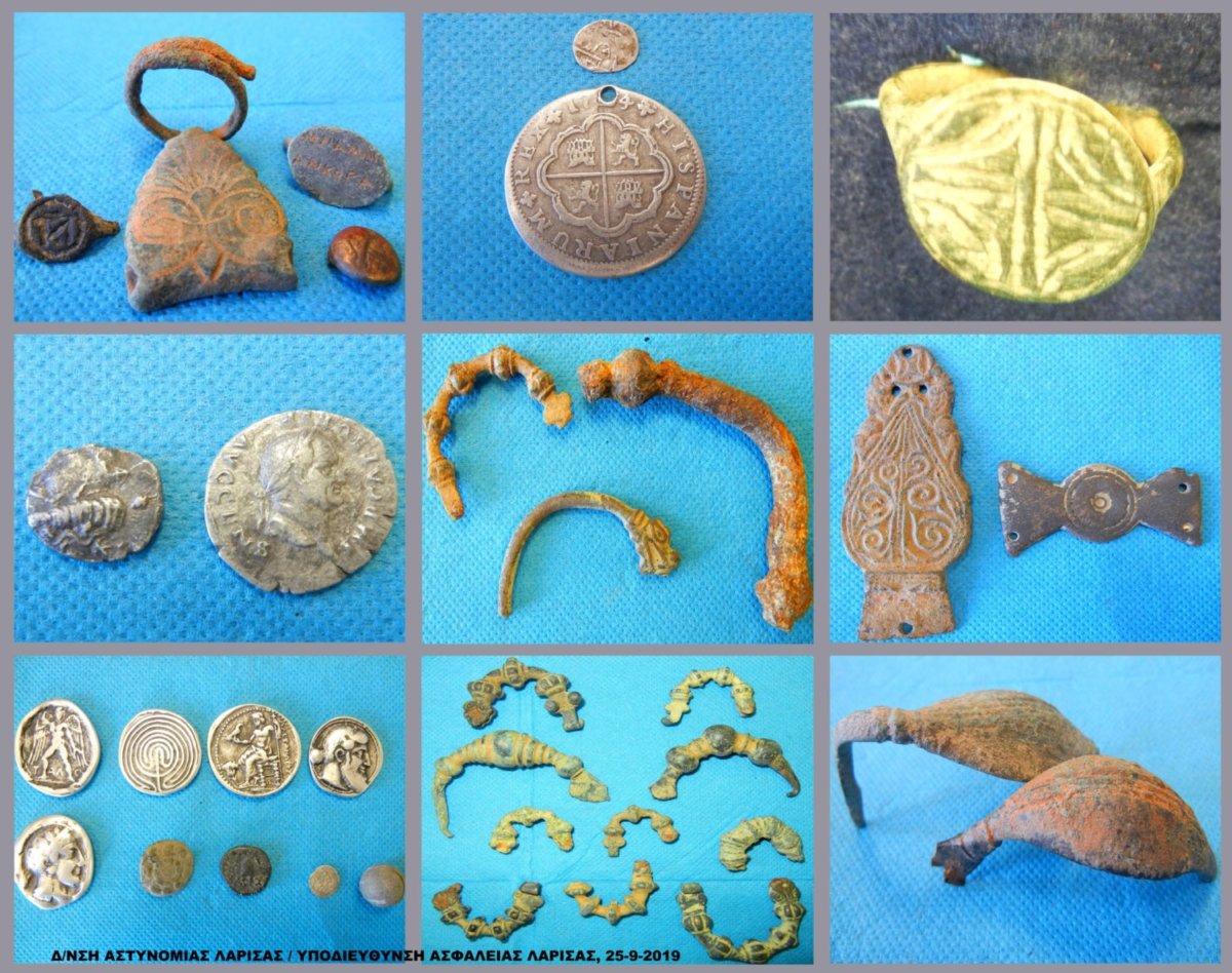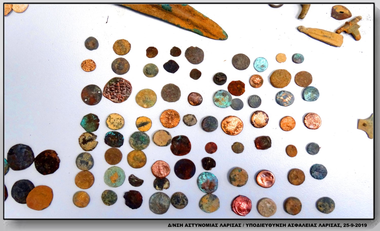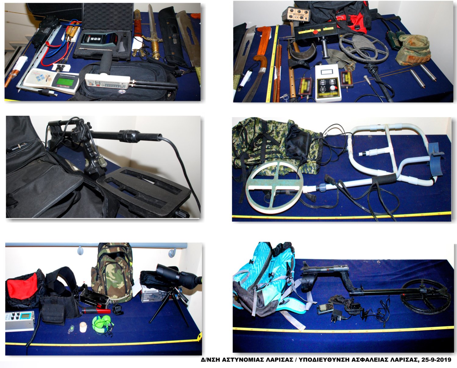 Κατά τη διάρκεια νομότυπων ερευνών, κατασχέσαμε μεγάλο αριθμό αντικειμένων, τα οποία σύμφωνα με τις εκτιμήσεις των Αρχαιολόγων της Εφορείας Αρχαιοτήτων Λάρισας εμπίπτουν στη νομοθεσία περί προστασίας των αρχαιοτήτων και εν γένει της πολιτιστικής κληρονομιάς, συσκευές ηλεκτρονικής ραβδοσκοπίας – ανίχνευσης μετάλλων, όπλα και φυσίγγια.