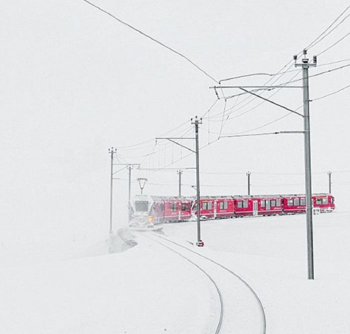 «Το τρένο βγαίνει από το τούνελ και περνά κατευθείαν σε τοξωτή γέφυρα σε ύψος 65 μέτρων. Το λαμπερό κόκκινο χρώμα του τρένου ξεχωρίζει ανάμεσα στο ολόλευκο χιόνι και το μπλε του ουρανού».