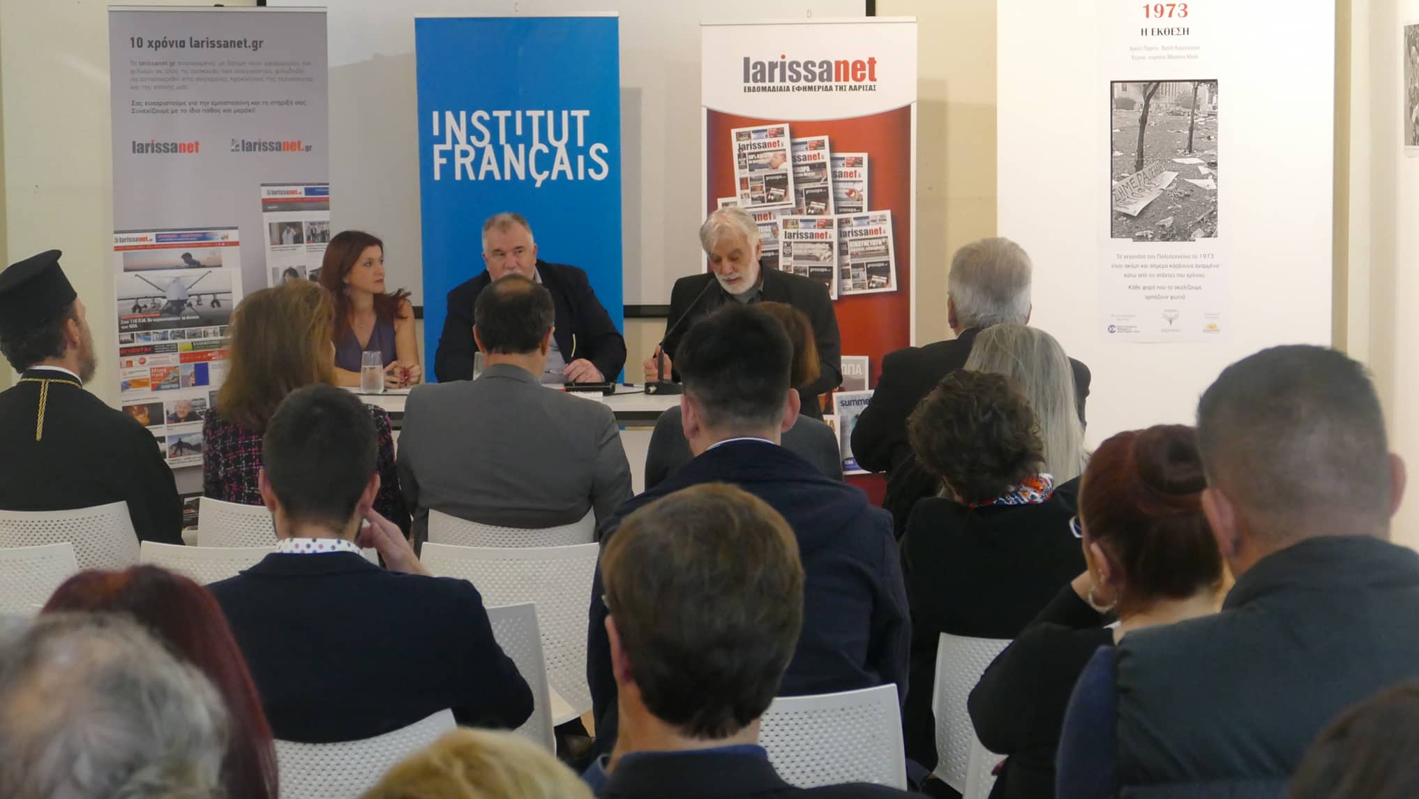 Εγκαινιάστηκε σήμερα στο Γαλλικό Ινστιτούτο Λάρισας η έκθεση φωτογραφίας με τίτλο «Πολυτεχνείο 1973», από τα αρχεία του βετεράνου φωτορεπόρτερ Βασίλη Καραγεώργου, έκθεση που συνδιοργανώνουν η εβδομαδιαία εφημερίδα larissanet, το larissanet.gr και οι εκδόσεις Flippress σε συνεργασία με την Ένωση Συντακτών Περιοδικού και Ηλεκτρονικού Τύπου (ΕΣΠΗΤ) και το Γαλλικό Ινστιτούτο Λάρισας.
