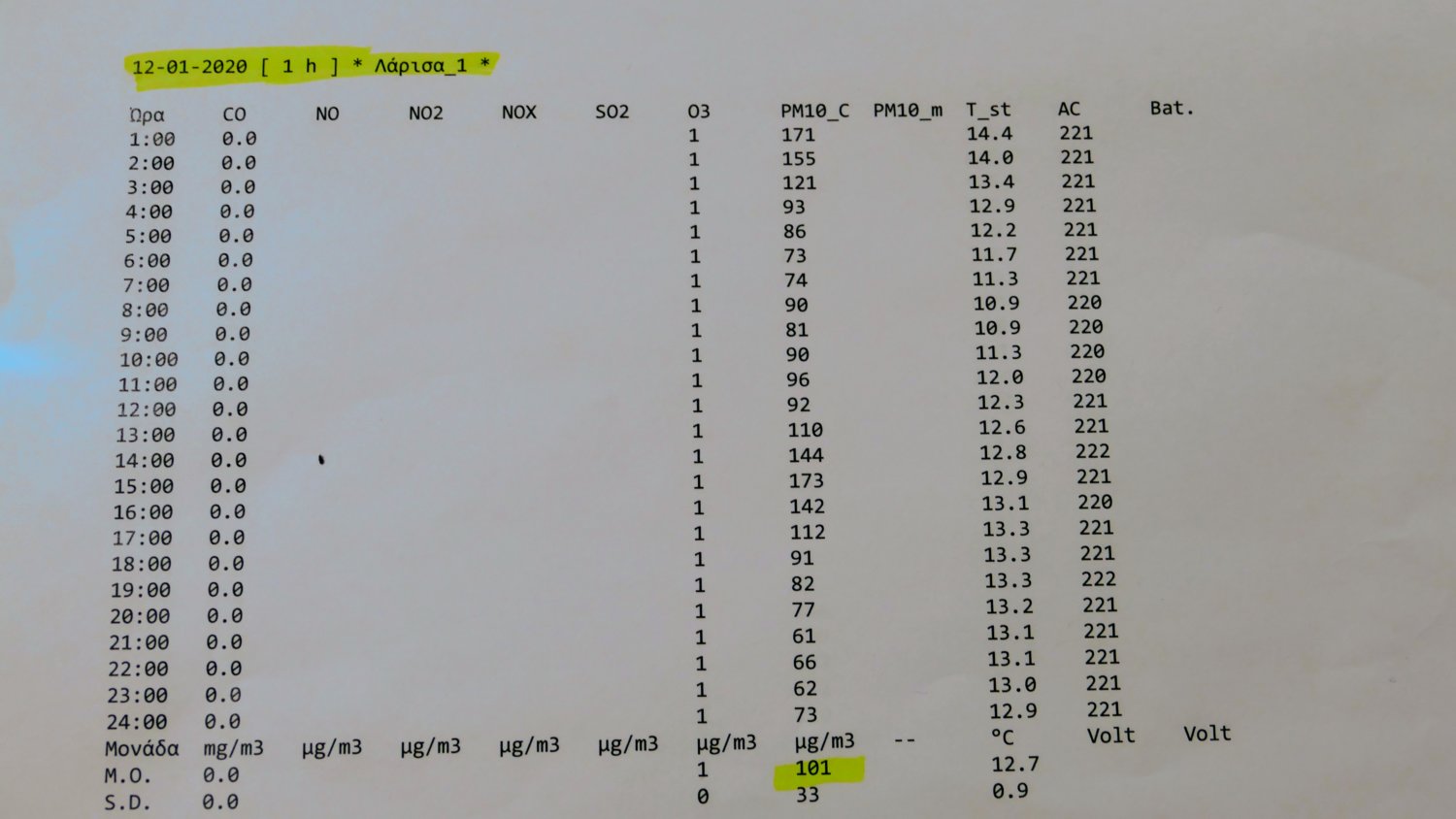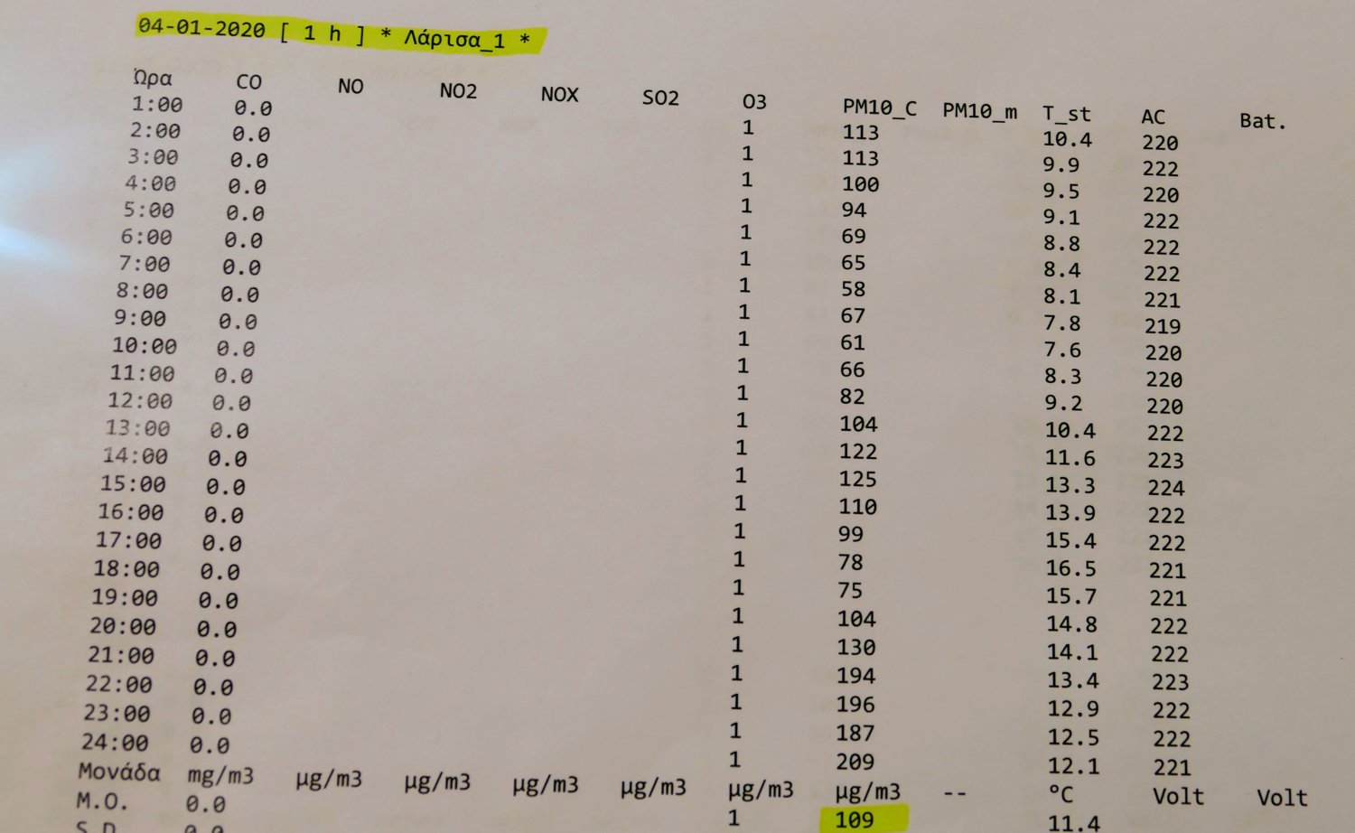 Στις 4 Ιανουαρίου ο σταθμός καταγράφει κατά μέσο όρο 109 μg/m3 στην ατμόσφαιρα της Λάρισας. Την υψηλότερη μέτρηση του τελευταίου μήνα. Όμως αν δούμε ανά ώρα τα αποτελέσματα από το απόγευμα η μέτρηση δείχνει να ανεβαίνει ο δείκτης στα 104 μg/m3 και τα μεσάνυχτα προς την 5η Ιανουαρίου να είναι 209 μg/m3! Την ίδια ημέρα, τις μεσημβρινές ώρες, επίσης καταγράφονται συγκεντρώσεις που ξεπερνούν τα 100 μg/m3.