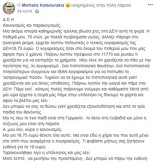 Μα για 18,75 ευρώ θέλετε όλα αυτά; Μα είναι εδώ η χήρα του που αυτή μένει στο σπίτι που αναφέρεται ο λογαριασμός. Τι φοβάστε μήπως σας ζητήσουν ευθύνη για τα 18 ευρώ;