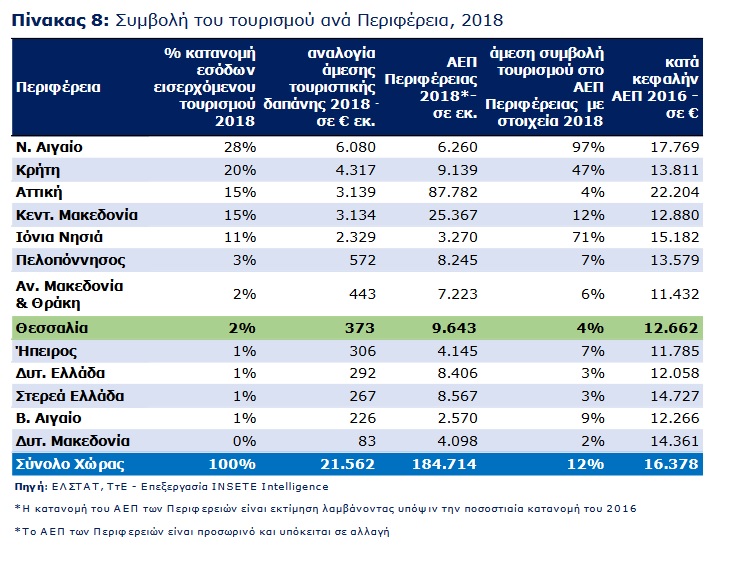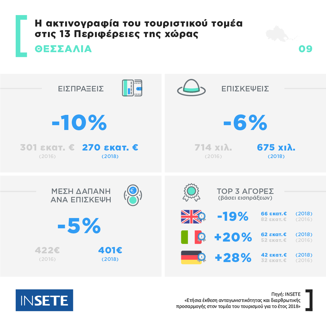 To Ινστιτούτο του Συνδέσμου Ελληνικών Τουριστικών Επιχειρήσεων (ΙΝΣΕΤΕ) έδωσε στη δημοσιότητα την πρώτη έκδοση των Ετήσιων Εκθέσεων Ανταγωνιστικότητας και Διαρθρωτικής Προσαρμογής στον Τομέα του Τουρισμού των 13 Περιφερειών της χώρας. Σύμφωνα με το Ινστιτούτο τα στοιχεία για την Περιφέρεια Θεσσαλίας είναι απογοητευτικά καθώς οι επισκέψεις βρίσκονται στο -6%, από 714 χιλ. σε 675 χιλ., οι εισπράξεις στο -10%, από 301 εκατ. ευρώ σε 270 εκατ. ευρώ και η μέση δαπάνη στο -5% από 422 ευρώ σε 401 ευρώ.