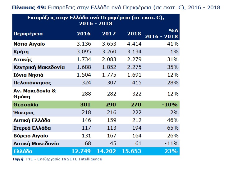 Ειδικότερα, ανά Περιφέρεια οι επισκέψεις, οι τουριστικές εισπράξεις και η μέση δαπάνη ανά επίσκεψη στην Ελλάδα και το ποσοστό μεταβολής μεταξύ 2016 και 2018 διαμορφώθηκαν ως εξής: