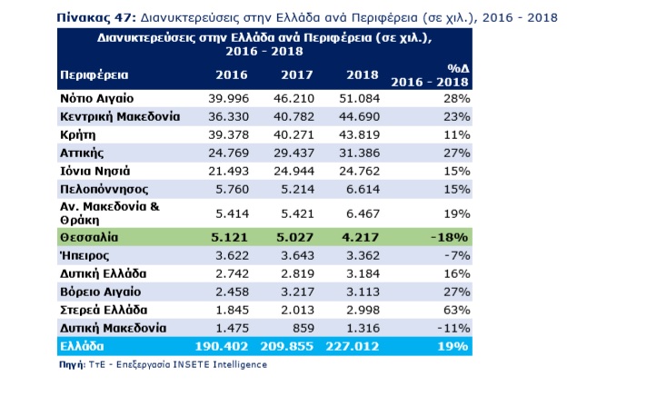 Η Περιφέρεια Θεσσαλίας αντιπροσωπεύει το 2% των επισκέψεων που καταγράφηκαν στις Περιφέρειες της Ελλάδας το 2018, σημειώνοντας μείωση κατά 6% σε σύγκριση με το 2016 (από 714 χιλ. σε 675 χιλ.). Αναφορικά με τις χώρες προέλευσης η εικόνα είναι μεικτή, με τις αγορές της Ιταλίας (+18%, από 101 χιλ. το 2016 σε 119 χιλ. το 2018) και της Γερμανίας (+7%, από 63 χιλ. σε 67 χιλ.) να καταγράφουν αύξηση και τις αγορές του Ην. Βασιλείου (-12%, από 113 χιλ. σε 100 χιλ.), της Ρουμανίας (-45%, από 54 χιλ. σε 29 χιλ.) και των λοιπών (-6%, από 384 χιλ. σε 360 χιλ.) μείωση.