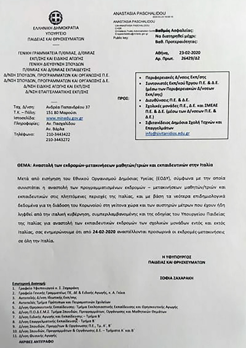 Αναστέλλονται από τις 24/2 όλες οι εκπαιδευτικές εκδρομές που προγραμματίζονταν και προγραμματίζονται προς την Ιταλία, μέχρι νεωτέρας, κατόπιν εντολής της Υπουργού Παιδείας, Νίκης Κεραμέως.