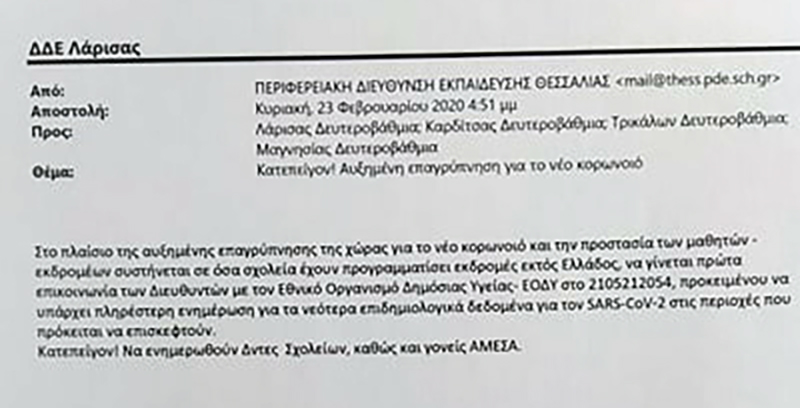 Την ίδια ώρα η Περιφερειακή Διεύθυνση Εκπαίδευσης Θεσσαλίας έχει εκδώσει οδηγία προς όλα τα σχολεία ζητώντας από τους διευθυντές τους πριν από οποιαδήποτε εκπαιδευτική εκδρομή εκτός Ελλάδας να συμβουλεύονται τον Εθνικό Οργανισμό Δημόσιας Υγείας, προκειμένου να ενημερώνονται άμεσα για τα νέα επιδημιολογικά δεδομένα