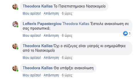 Στο χορό της διάχυσης της ψεύτικης είδησης μπήκε και η υποψήφια βουλευτής της Νέας Δημοκρατίας Θεοδώρα Κάλλα, η οποία με σχόλιό της σε μέσο κοινωνικής δικτύωσης αφενός επιβεβαίωνε τη φήμη, αφετέρου ισχυριζόταν ότι είχε πληροφόρηση από «μέσα» καθώς ο άντρας της είναι γιατρός και γνώριζε τη συνέβη στο Νοσοκομείο. Επίσης, διαβεβαίωνε πως θα υπάρξει και επίσημη ανακοίνωση!