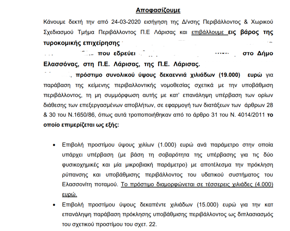 Πρόστιμο ύψους 19.000 επέβαλε η διεύθυνση Περιβάλλοντος και Χωρικού Σχεδιασμού της Περιφέρειας Θεσσαλίας σε τυροκομική επιχείρηση για την μόλυνση που προκάλεσε στον Ελασσονίτη ποταμό. Το συνολικό πρόστιμο ανέρχεται στο ποσό των 19.000 ευρώ. 4.000 ευρώ αντιστοιχούν στο πρόστιμο για την μόλυνση λόγω υπέρβασης των ορίων και άλλα 15.000 ευρώ «για την κατ’ επανάληψη παράβαση πρόκλησης υποβάθμισης του περιβάλλοντος», όπως αναφέρει η εκδοθείσα απόφαση.