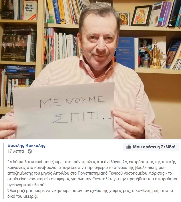 «Οι δύσκολοι καιροί που ζούμε απαιτούν πράξεις και όχι λόγια. Ως εκπρόσωπος της τοπικής κοινωνίας στο κοινοβούλιο, αποφάσισα να προσφέρω το σύνολο της βουλευτικής μου αποζημίωσης του μηνός Απριλίου στο Πανεπιστημιακό Γενικού νοσοκομείου Λάρισας – το οποίο είναι νοσοκομείο αναφοράς για όλη την Θεσσαλία- για την προμήθεια του απαραίτητου υγειονομικού υλικού.