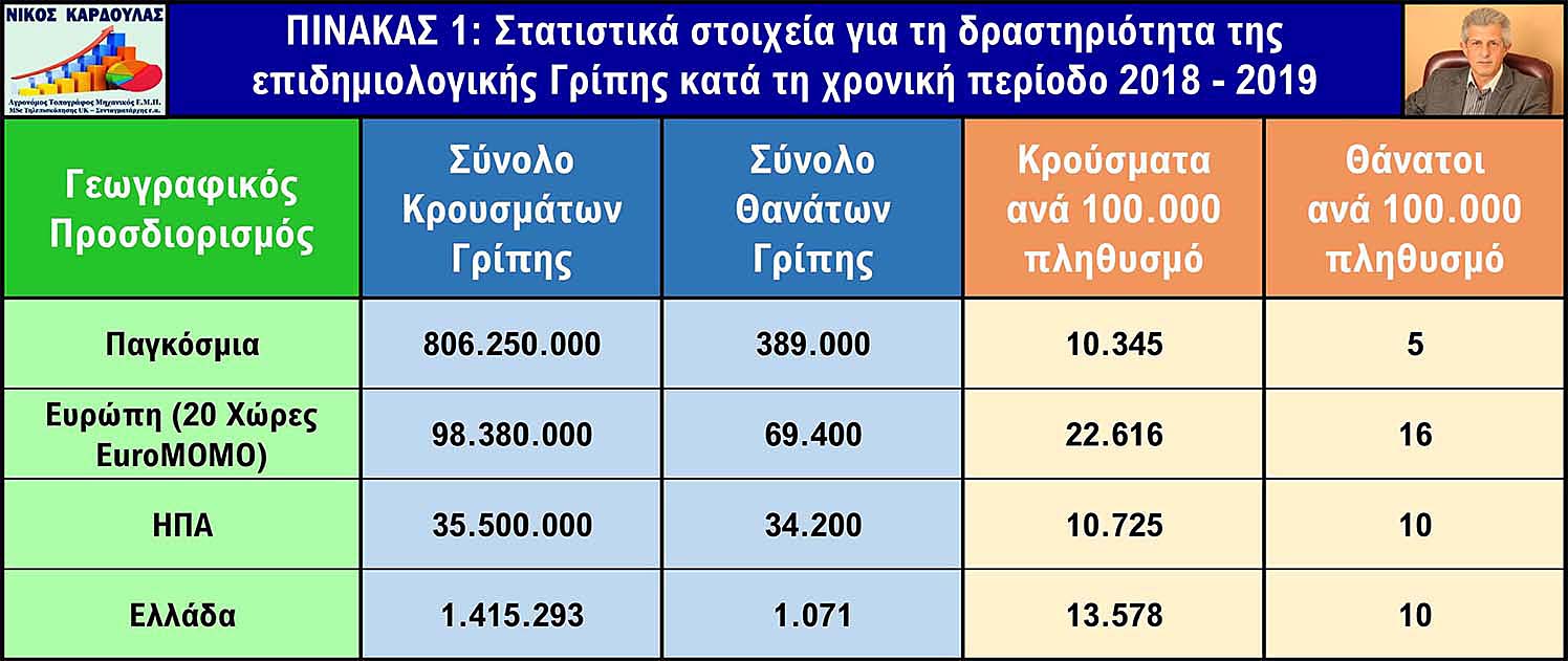 Όπως φαίνεται στον πίνακα 1, συσχετίζονται 5 θάνατοι με τη γρίπη ανά 100.000 πληθυσμό παγκοσμίως, 16 στην Ευρώπη και 10 σε ΗΠΑ και Ελλάδα, κατά την περίοδο 2018-2019.