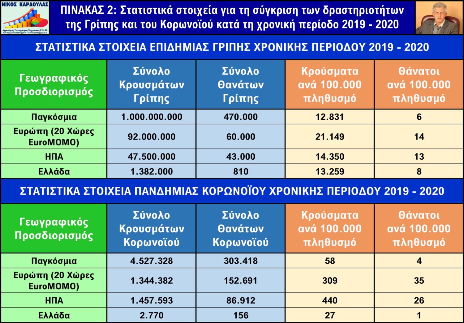 Στον πίνακα 2 απεικονίζεται επίσης και η δραστηριότητα του κορωνοϊού κατά τη χρονική περίοδο 2019-2020. Μέχρι σήμερα συσχετίζονται με τον κορωνοϊό 303.418 θάνατοι παγκοσμίως, 152.691 στην Ευρώπη (χώρες Euro-MOMO), 86.912 στις ΗΠΑ και 156 στην Ελλάδα.