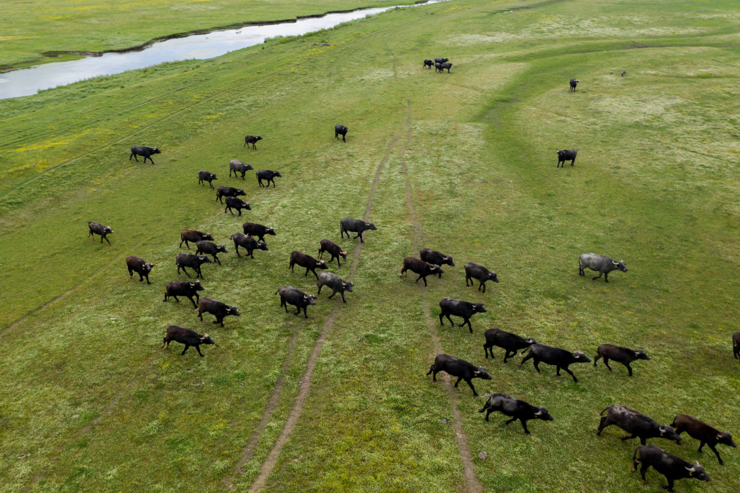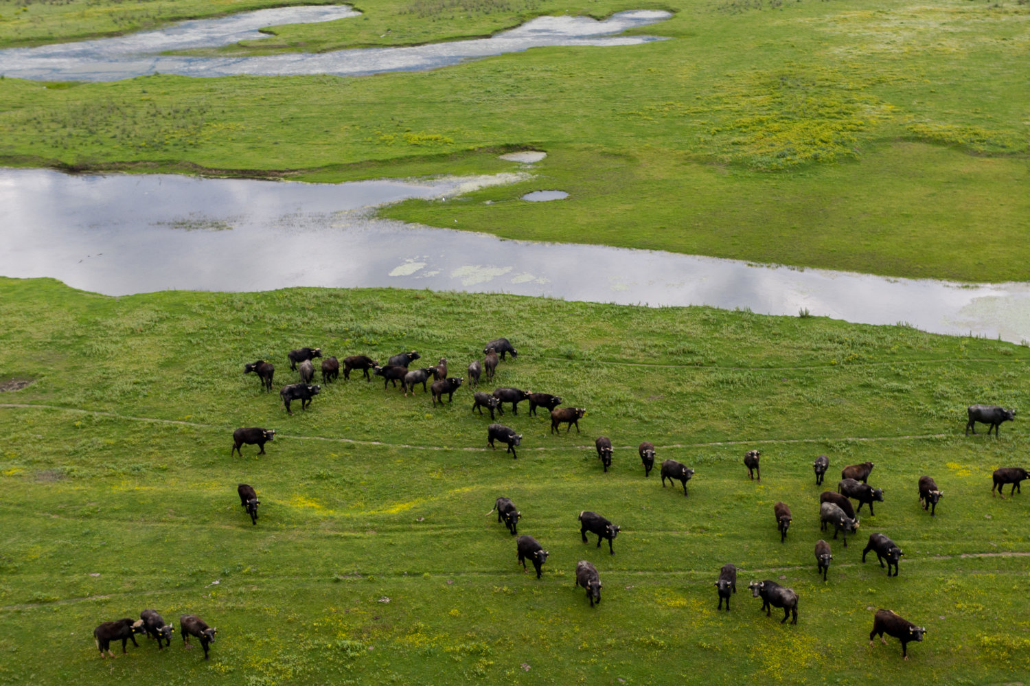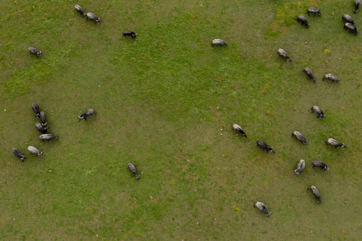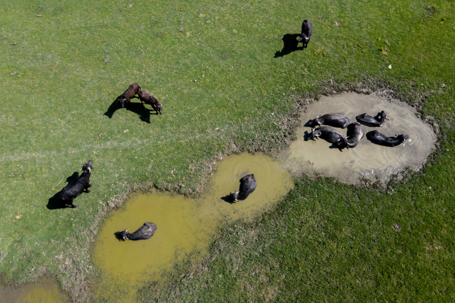 Κοπάδια από βουβάλια βόσκουν στις όχθες της λίμνης Κερκίνης. Οι αεροφωτογραφίες είναι του Αντώνη Νικολόπουλου για την Eurokinissi.